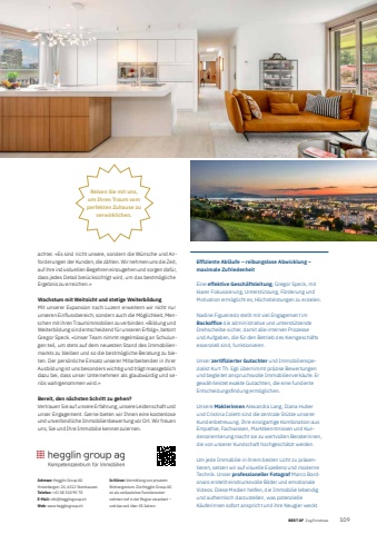 BEST OF Zug Ennetsee 109BEST OF Portrait xxx 2Adresse: Hegglin Group AGHinterbergstr. 24, 6312 SteinhausenTelefon: +41 58 510 95 70E-Mail: info@hegglingroup.chWeb: www.hegglingroup.chIn K%u00fcrze: Vermittlung von privatem Wohneigentum. Die Hegglin Group AG ist als verl%u00e4ssliches Familienunternehmen tief in der Region verankert %u2013 und das seit %u00fcber 45 Jahren.achter. %u00abEs sind nicht unsere, sondern die W%u00fcnsche und Anforderungen der Kunden, die z%u00e4hlen. Wir nehmen uns die Zeit, auf ihre individuellen Begehren einzugehen und sorgen daf%u00fcr, dass jedes Detail ber%u00fccksichtigt wird, um das bestm%u00f6gliche Ergebnis zu erreichen.%u00bbWachstum mit Weitsicht und stetige WeiterbildungMit unserer Expansion nach Luzern erweitern wir nicht nur unseren Einflussbereich, sondern auch die M%u00f6glichkeit, Menschen mit ihren Traumimmobilien zu verbinden. %u00abBildung und Weiterbildung sind entscheidend f%u00fcr unseren Erfolg%u00bb, betont Gregor Speck. %u00abUnser Team nimmt regelm%u00e4ssig an Schulungen teil, um stets auf dem neuesten Stand des Immobilienmarkts zu bleiben und so die bestm%u00f6gliche Beratung zu bieten. Der pers%u00f6nliche Einsatz unserer Mitarbeitenden in ihrer Ausbildung ist uns besonders wichtig und tr%u00e4gt massgeblich dazu bei, dass unser Unternehmen als glaubw%u00fcrdig und seri%u00f6s wahrgenommen wird.%u00bbBereit, den n%u00e4chsten Schritt zu gehen?Vertrauen Sie auf unsere Erfahrung, unsere Leidenschaft und unser Engagement. Gerne bieten wir Ihnen eine kostenlose und unverbindliche Immobilienbewertung vor Ort. Wir freuen uns, Sie und Ihre Immobilie kennenzulernen. Effi ziente Abl%u00e4ufe %u2013 reibungslose Abwicklung %u2013 maximale ZufriedenheitEine effektive Gesch%u00e4ftsleitung, Gregor Speck, mit klarer Fokussierung, Unterst%u00fctzung, F%u00f6rderung und Motivation erm%u00f6glicht es, H%u00f6chstleistungen zu erzielen.Nadine Figueiredo stellt mit viel Engagement im Backoffi ce die administrative und unterst%u00fctzende Drehscheibe sicher, damit alle internen Prozesse und Aufgaben, die f%u00fcr den Betrieb des Kerngesch%u00e4fts essenziell sind, funktionieren.Unser zertifi zierter Gutachter und Immobilienspezialist Kurt Th. Egli %u00fcbernimmt pr%u00e4zise Bewertungen und begleitet anspruchsvolle Immobilienverk%u00e4ufe. Er gew%u00e4hrleistet exakte Gutachten, die eine fundierte Entscheidungsfi ndung erm%u00f6glichen.Unsere Maklerinnen Alexandra Lang, Diana Huber und Cristina Coletti sind die zentrale St%u00fctze unserer Kundenbetreuung. Ihre einzigartige Kombination aus Empathie, Fachwissen, Marktkenntnissen und Kundenorientierung macht sie zu wertvollen Beraterinnen, die von unserer Kundschaft hochgesch%u00e4tzt werden. Um jede Immobilie in ihrem besten Licht zu pr%u00e4sentieren, setzen wir auf visuelle Exzellenz und moderne Technik. Unser professioneller Fotograf Marco Bordonaro erstellt eindrucksvolle Bilder und emotionale Videos. Diese Medien helfen, die Immobilie lebendig und authentisch darzustellen, was potenzielle K%u00e4uferinnen sofort anspricht und ihre Neugier weckt.Reisen Sie mit uns, um Ihren Traum vom perfekten Zuhause zu verwirklichen.