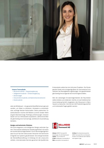 BEST OF BEST OF Zug Ennetsee Portrait xxx 1132Unsere Trennw%u00e4nde%u2022 B%u00fcrotrennw%u00e4nde %u2013 Doppelverglasung%u2022 Vollglastrennw%u00e4nde %u2013 Einfachverglasung%u2022 Deckensegel%u2022 Industrietrennw%u00e4nde und Kabinenkonstruktionen%u2022 Kreativw%u00e4ndeAdresse: SWISS Trennwand AGHinterbergstr. 47, 6312 SteinhausenTelefon: +41 41 740 64 70E-Mail: info@system-trennwaende.chWeb: www.system-trennwaende.chIn K%u00fcrze: Eine Systemtrennwand der SWISS Trennwand AG ist ein Schweizer Produkt. Sie ist jederzeit sofort lieferbar dank eigenem Lager.oder als Whiteboard %u2013 die gesamte Wandfl%u00e4che kann genutzt werden, um Ideen zu skizzieren, Konzepte zu entwickeln oder wichtige Notizen festzuhalten. Diese praktischen Zusatzfunktionen machen die W%u00e4nde zu einem idealen Werkzeug f%u00fcr Brainstormings, Meetings und Schulungen. Visionen lassen sich so in Windeseile visualisieren, w%u00e4hrend die W%u00e4nde gleichzeitig eine hochwertige, %u00e4sthetische Ausstrahlung behalten.Design und technische Pr%u00e4zisionMit ihrem eleganten und intelligenten Design verbinden System-Trennw%u00e4nde %u00e4sthetische Gestaltungsfreiheit mit endlosen Kombinationsm%u00f6glichkeiten. Durch das einzigartige Konzept ist auch bei den exklusivsten Versionen die technische Integrit%u00e4t des Systems gew%u00e4hrleistet. Die strenge Kontrolle der Rohstoffbeschaffung im Einklang mit den anspruchsvollsten, internationalen Normen garantiert die Qualit%u00e4t des Endprodukts selbst bei den k%u00fchnsten Projekten. Die Montagewand bietet eine einzigartige Basis f%u00fcr permanente Innovationen bei Raumgliederungsl%u00f6sungen und gew%u00e4hrleistet gleichzeitig hervorragende technische Eigenschaften. Wer die vielseitigen Einsatzm%u00f6glichkeiten der Raumteiler selbst erleben und entdecken m%u00f6chte, ist nach telefonischer Voranmeldung herzlich eingeladen, den Showroom in Steinhausen zu besuchen. Hier k%u00f6nnen die Produkte begutachtet und individuelle Fragen gekl%u00e4rt werden.