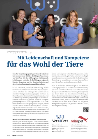 116 BEST OF BEST OF Zug Ennetsee Portrait xxx Mit Leidenschaft und Kompetenzf%u00fcr das Wohl der TiereAdresse: Vets4Pets AGSumpfstrasse 32, 6312 SteinhausenTelefon: +41 41 741 04 04E-Mail: info@vets4pets.swissWeb: www.vets4pets.swissIn K%u00fcrze: Erst 2022 er%u00f6ffnet, aber schon gut etabliert: Mit viel Fachwissen und modernsten Apparaturen sichert das Team von Vets4Pets die medizinische Grundversorgung von Kleintieren. TPA Noelia Elsener mit den drei Inhaberinnen Martina Cathry, Evelyne Streuli und Marion Ackermann (v. l.) Dem Tier Respekt entgegenbringen. Dieser Grundsatz ist fest verankert in der DNA des f%u00fcnfk%u00f6pfi gen Frauenteams von Vets4Pets. Seit der Er%u00f6ffnung ihrer Kleintierpraxis in Steinhausen verbinden sie Einf%u00fchlungsverm%u00f6gen mit h%u00f6chster Kompetenz, was ihre tierischen Patienten und deren Besitzer:innen durchaus zu sch%u00e4tzen wissen. Sie sind authentisch, empathisch und fachkundig, die drei Inhaberinnen und die Tiermedizinischen Praxisassistentinnen von Vets4Pets. Und seit einiger Zeit rundet zudem ein m%u00e4nnlicher Kollege das Leistungsangebot der Praxis ab. Marco Mouwen ist diplomierter Tierphysiotherapeut und hat die Behandlung von Bewegungsst%u00f6rungen bei Hunden und Katzen zu seiner Berufung gemacht. Jeweils am Freitagmorgen empf%u00e4ngt er seine vierbeinigen Patienten. %u00abEine solide Vertrauensbasis ist unser ganz grosses Anliegen%u00bb, betont Tier%u00e4rztin und eine der drei Inhaberinnen, Marion Ackermann. Jegliche Art von Stress soll bei den Tieren minimiert werden, was allerdings oft bei den Besitzer:innen anf%u00e4ngt und sich auf die Tiere %u00fcbertr%u00e4gt. Deshalb ist die freundliche und offene Atmosph%u00e4re seit Er%u00f6ffnung der Praxis im September 2022 eine St%u00e4rke des Teams. Menschen auf Bed%u00fcrfnisse ihrer Tiere sensibilisierenDass bei jeder Anschaffung eines Tieres vor allem die Verantwortung f%u00fcr dessen Wohlergehen im Vordergrund stehen soll, ist keine Frage. Dennoch wird dies in manchen F%u00e4llen auf die leichte Schulter genommen. %u00abSpeziell bei sogenannten Moderassen sehen wir, dass Tiere gesundheitlich anf%u00e4lliger sind. Die Besitzer:innen reagieren dabei oft %u00fcberrascht, nicht zuletzt auch wegen der hohen Behandlungskosten, welche damit verbunden sind%u00bb, gibt Marion Ackermann zu. Da gilt es, die Besitzer:innen entsprechend f%u00fcr die Bed%u00fcrfnisse ihrer Sch%u00fctzlinge zu sensibilisieren, denn das Wohl des Tieres steht f%u00fcr das Team von Vets4Pets an erster Stelle. Auch im Bereich der Zahnmedizin gibt es eine Weiterentwicklung. Spezialistin f%u00fcr Tierzahnheilkunde Martina Cathry absolviert derzeit ihren Master of Advanced Studies bei der European School for Advanced Veterinary Studies (ESAVS) auf diesem Gebiet. Von der umfassenden Befundung inklusive Dentalr%u00f6ntgen %u00fcber Zahnreinigungen, chirurgische Zahnextraktionen und Wurzelbehandlungen, um nur einige Beispiele zu nennen, bietet sie die ganze Palette modernster Zahnheilkunde an. Denn: %u00abAuch die Mund- und Zahngesundheit geh%u00f6rt massgebend zum gesunden Leben des Tieres%u00bb, bekr%u00e4ftigt Martina Cathry.
