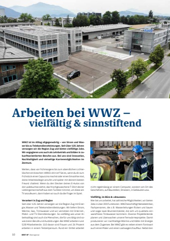 10 BEST OF BEST OF %u00dcberregional Portrait xxxArbeiten bei WWZ %u2013 vielf%u00e4ltig & sinnstiftendWWZ ist im Alltag allgegenw%u00e4rtig %u2013 von Strom und Wasser bis zu Telekomdienstleistungen. Seit %u00fcber 125 Jahren versorgen wir die Region Zug und bieten vielf%u00e4ltige Jobs. Wir engagieren uns auch als Lehrbetrieb und bilden in zukunftsorientierten Berufen aus. Bei uns sind Innovation, Nachhaltigkeit und vielseitige Karrierem%u00f6glichkeiten im Zentrum.Wetten, dass von fr%u00fchmorgens bis zum abendlichen Lichterl%u00f6schen ein bisschen %u00abWWZ%u00bb drin ist? Sei es, wenn du dir zum Fr%u00fchst%u00fcck einen Capuccino machst oder einen Smoothie mixt, deine Arbeitskollegin anrufst und sp%u00e4ter mit deinem besten Freund chattest. Wenn du den Stecker deines E-Autos von der Ladebuchse ziehst, das frischgewaschene T-Shirt deiner Lieblingsmannschaft aus dem Tumbler nimmst, um diese am TV anzufeuern, dann haben wir auch da die Finger im Spiel. Verankert in Zug und RegionSeit %u00fcber 125 Jahren versorgen wir die Region Zug mit Energie, Wasser und Telekomdienstleistungen. Wir liefern Strom, W%u00e4rme, Gas, Trinkwasser und wir vernetzen mit Internet-, Mobil- und TV-Dienstleistungen. So vielf%u00e4ltig wie unser Arbeitsalltag sind auch die Menschen, die f%u00fcr uns t%u00e4tig sind sowie deren Berufe und Ausbildungen. Bei WWZ arbeiten rund 528 Mitarbeitende. 110 davon sind Frauen und 24 Prozent arbeiten in einem Teilzeitpensum. Rund ein Drittel arbeitet nicht regelm%u00e4ssig an einem Computer, sondern am Ort des Geschehens, auf Baustellen, Strassen, in Geb%u00e4uden usw.Vielf%u00e4ltig, im B%u00fcro & %u00abdraussen%u00bbWer bei uns arbeitet, hat zahlreiche M%u00f6glichkeiten; wir bieten Jobs in %u00fcber 200 Funktionen. WWZ besch%u00e4ftigt Netzelektriker, Fachpersonen, die z. B. Wasserleitungen flicken und bauen und sogar zwei Brunnenmeister, die sich um qualitativ einwandfreies Trinkwasser k%u00fcmmern. Diverse Projektleitende planen und %u00fcberwachen unsere Fernw%u00e4rmeprojekte. Damit produzieren wir nachhaltige W%u00e4rme und K%u00e4lte mit Energie aus dem Zugersee. Bei WWZ gibt es neben einem Forstwart auch einen Maler und einen Lastwagenchauffeur. Nebst den