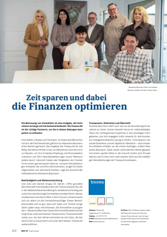 122 BEST OF Zug Ennetsee 1 BEST OF Portrait xxx Zeit sparen und dabeidie Finanzen optimierenAdresse: Treowa AGZugerstrasse 17, 6330 ChamTelefon: +41 729 71 79E-Mail: alexandra.baumann@treowa.chWeb: www.treowa.chIn K%u00fcrze: Zeit und Nerven sparen, dabei hilft Ihnen die Treowa AG. Denn die Chamer Firma k%u00fcmmert sich mit langj%u00e4hriger Erfahrung und viel Fachwissen um s%u00e4mtliche Aufgaben im Bereich Immobilien.Die Betreuung von Immobilien ist eine Aufgabe, die Fachwissen verlangt und viel Aufwand bedeutet. Die Treowa%u00a0AG ist die richtige Partnerin, um Sie in diesen Belangen kompetent zu entlasten.Immobilien, Inkasso und Treuhand. In diesen drei Bereichen hat sich der Familienbetrieb, gef%u00fchrt von Alexandra Baumann, einen Namen gemacht. Das Angebot der Treowa%u00a0AG ist vielf%u00e4ltig: Sie betreut Mieter:innen und Bewohner, k%u00fcmmert sich um Bauten, um ihre Finanzbuchhaltung und Personaladministration und f%u00fchrt Bonit%u00e4tsabkl%u00e4rungen sowie Mahnprozedere durch. Dennoch haben alle T%u00e4tigkeiten der Chamer Firma einen gemeinsamen Nenner. %u00abUnsere Dienstleistungen entlasten Sie und Ihre Administration, sorgen f%u00fcr beste Organisation und optimierte Kosten%u00bb, sagt die studierte Betriebs%u00f6konomin Alexandra Baumann. Best%u00e4ndigkeit und WeiterentwicklungUnd dies seit bereits knapp 30 Jahren. 1996 gr%u00fcndete Rechtsanwalt Andreas Baumann die Treowa Inkasso AG, die in der Debitorenbewirtschaftung f%u00fcr die Baubranche t%u00e4tig war und schon damals einige Immobilienmandate f%u00fchrte. Alexandra Baumann trat dann 2003 in die Firma ein und k%u00fcmmerte sich vor allem um die Immobilienauftr%u00e4ge. Dieser Bereich entwickelte sich so gut, dass sich Vater und Tochter einige Jahre sp%u00e4ter dazu entschlossen, die Immobilien auszugliedern. Alexandra Baumann baute die Immobilienbewirtschaftung fortan unter dem Namen Treowa Immo Treuhand GmbH weiter aus. Vor drei Jahren entschied sie sich dazu, die beiden Firmen zu fusionieren und unter dem Namen Treowa%u00a0AG weiterzuf%u00fchren. Transparenz, Diskretion und %u00dcbersichtAndreas Baumann steht nach wie vor als Verwaltungsrat beratend zur Seite. Zudem besteht heute ein siebenk%u00f6pfi ges Team mit umfangreicher Expertise in den jeweiligen Fachgebieten, das sich engagiert daf%u00fcr einsetzt f%u00fcr alle Kunden die massgeschneiderte L%u00f6sung zu fi nden. %u00abTransparenz, absolute Diskretion und ein objektiver %u00dcberblick %u2013 nach diesen Grunds%u00e4tzen erf%u00fcllen wir all unsere Auftr%u00e4ge%u00bb, erkl%u00e4rt Alexandra Baumann. Dank dieser verbindlichen Werte gepaart mit einem wachen Blick in die Zukunft d%u00fcrfen sich Private ebenso wie Firmen noch viele weitere Jahre auf die vielf%u00e4ltigen Dienstleistungen der Treowa%u00a0AG verlassen. Alexandra Baumann (links) mit Andreas Baumann (mitte) und dem Treowa-Team.