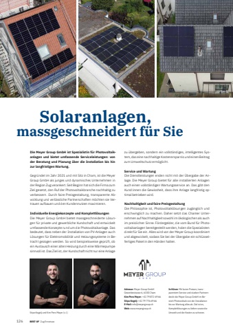 126 BEST OF Zug Ennetsee 1 BEST OF Portrait xxx Solaranlagen,massgeschneidert f%u00fcr SieAdresse: Meyer Group GmbHGewerbestrasse 6, 6330 ChamKim Pero Meyer: +41 79 872 69 66 Stipo Kegelj: +41 79 776 69 66E-Mail: info@meyergroup.chWeb: www.meyergroup.chIn K%u00fcrze: Mit fairen Preisen, transparentem Service und starken Partnern deckt die Meyer Group GmbH im Bereich Photovoltaik von der Installation bis zur Wartung alles ab. Ziel ist es, Komplettl%u00f6sungen zu liefern sowie die Umwelt und die Kosten zu schonen.Die Meyer Group GmbH ist Spezialistin f%u00fcr Photovoltaikanlagen und bietet umfassende Serviceleistungen: von der Beratung und Planung %u00fcber die Installation bis hin zur langfristigen Wartung. Gegr%u00fcndet im Jahr 2021 und mit Sitz in Cham, ist die Meyer Group GmbH als junges und dynamisches Unternehmen in der Region Zug verankert. Seit Beginn hat sich die Firma zum Ziel gesetzt, den Ruf der Photovoltaikbranche nachhaltig zu verbessern. Durch faire Preisgestaltung, transparente Abwicklung und verl%u00e4ssliche Partnerschaften m%u00f6chten sie Vertrauen aufbauen und den Kundennutzen maximieren.Individuelle Energiekonzepte und Komplettl%u00f6sungenDie Meyer Group GmbH bietet massgeschneiderte L%u00f6sungen f%u00fcr private und gewerbliche Kundschaft und entwickelt umfassende Konzepte rund um die Photovoltaikanlage. Das bedeutet, dass neben der Installation von PV-Anlagen auch L%u00f6sungen f%u00fcr Elektromobilit%u00e4t und Heizungssysteme in Betracht gezogen werden. So wird beispielsweise gepr%u00fcft, ob ein Austausch einer alten Heizung durch eine W%u00e4rmepumpe sinnvoll ist. Das Ziel ist, der Kundschaft nicht nur eine Anlage zu %u00fcbergeben, sondern ein vollst%u00e4ndiges, intelligentes System, das eine nachhaltige Kostenersparnis und einen Beitrag zum Umweltschutz erm%u00f6glicht.Service und Wartung Die Dienstleistungen enden nicht mit der %u00dcbergabe der Anlage. Die Meyer Group bietet f%u00fcr alle installierten Anlagen auch einen vollst%u00e4ndigen Wartungsservice an. Das gibt den Kund:innen die Gewissheit, dass ihre Anlage langfristig optimal betrieben wird.Nachhaltigkeit und faire PreisgestaltungDie Philosophie ist, Photovoltaikl%u00f6sungen zug%u00e4nglich und erschwinglich zu machen. Daher setzt das Chamer Unternehmen auf Nachhaltigkeit sowohl im %u00f6kologischen als auch im preislichen Sinne. F%u00f6rdergelder, die vom Bund f%u00fcr Photovoltaikanlagen bereitgestellt werden, holen die Spezialisten direkt f%u00fcr Sie ein. Alles wird von der Meyer Group koordiniert und abgewickelt, sodass Sie bei der %u00dcbergabe ein schl%u00fcsselfertiges Paket in den H%u00e4nden halten.Stipo Kegelj und Kim Pero Meyer (v. l.)