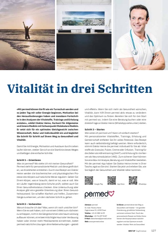 BEST OF BEST OF Zug Ennetsee Portrait xxx 1271Adresse: permedDr. med. Markus HeineZugerstrasse 51, 6330 ChamTelefon: +41 41 588 16 59WhatsApp: +41 76 697 94 87E-Mail: doktorheine@permed.onlineWeb: www.permed.onlineIn K%u00fcrze: permed ebnet den Weg zu Gesundheit und Vitalit%u00e4t %u2013 mit gezielter Orientierung, gr%u00fcndlicher Vorbereitung und einem sicheren Start. Durch das personalisierte Rezept von Doktor Heine k%u00f6nnen die K%u00f6rperprozesse nat%u00fcrlich reguliert und das Optimum erreicht werden: Vitalit%u00e4t. Mehr als Gesundheit.Vitalit%u00e4t in drei Schritten%u00abMit permed k%u00f6nnen Sie fi t wie ein Turnschuh werden und so jeden Tag mit voller Energie beginnen, Motivation bei den Herausforderungen haben und messbare Fortschritte in den Analysen der Vitalstoffe, Trainings und Erholung erzielen%u00bb, erkl%u00e4rt Doktor Heine, Facharzt f%u00fcr Allgemeine und Innere Medizin mit Schwerpunkt Molekulare Medizin. Er setzt sich f%u00fcr ein optimales Gleichgewicht zwischen Wissenschaft, Natur und Individualit%u00e4t ein und begleitet Sie Schritt f%u00fcr Schritt auf Ihrem Weg zu Gesundheit und Vitalit%u00e4t. Damit Sie mit Energie, Motivation und Ausdauer durchs Leben laufen k%u00f6nnen, stellen Sie sich an die Startlinie dieses Weges und befolgen drei einfache Schritte:Schritt 1 %u2013 OrientierenWas ist permed? Wo stehe ich mit meiner Gesundheit? Permed steht f%u00fcr personalisierte Medizin und diese greift dort an, wo Krankheiten entstehen. Durch das Rezept von Doktor Heine werden die biochemischen und physiologischen Prozesse des K%u00f6rpers auf nat%u00fcrliche Weise reguliert. Geben Sie Ihrem K%u00f6rper, was er braucht, damit er tut, was er soll. Wie ein L%u00e4ufer regelm%u00e4ssig seine Schuhe pr%u00fcft, sollten auch Sie Ihren Gesundheitsstatus checken. Eine Untersuchung oder Analyse gibt eine gezielte Orientierung %u00fcber Ihren Gesundheitszustand. Sie schaffen Klarheit und helfen, Zusammenh%u00e4nge zu erkennen, um den n%u00e4chsten Schritt zu gehen.Schritt 2 %u2013 VorbereitenWarum brauche ich das? Was, wenn ich noch unsicher bin? Wenn Sie es satt haben, sich von einem Infekt zum n%u00e4chsten zu schleppen, nicht in die G%u00e4nge kommen oder kaum Leistung aufbauen k%u00f6nnen, eine beeintr%u00e4chtigte Haut oder Verdauung haben oder immer mehr Medikamente einnehmen, bietet permed nat%u00fcrliche L%u00f6sungen ohne Nebenwirkungen %u2013 gezielt und effektiv. Wenn Sie sich mehr als Gesundheit w%u00fcnschen, Vitalit%u00e4t, dann hilft Ihnen permed aktiv etwas zu ver%u00e4ndern und das Optimum zu fi nden. Bereiten Sie sich f%u00fcr den Start mit permed vor, indem Sie eine Beratung buchen oder eine direkte Frage an Doktor Heine (WhatsApp siehe unten) stellen.Schritt 3 %u2013 StartenWie setze ich permed um? Kann ich einfach starten?Mit personalisierten Vitalstoffen, Trainings, Erholung und Gemeinschaft entfalten Sie Ihr volles Potenzial. Das Rezept kann auch selbstst%u00e4ndig befolgt werden. Wenn erforderlich, stimmt Doktor Heine die permed individuell f%u00fcr Sie ab: Vitalstoffe als Granulat, Pulver, Creme oder Infusion, Training f%u00fcr die Zellen als H%u00f6hentraining (IHHT) und Erholung f%u00fcr die Nerven als Neuromodulation (VNS). Zum sicheren Start k%u00f6nnen Sie eine Box mit Analyse, Beratung und Vitalstoffen bestellen. Mit der permed App haben Sie Doktor Heine immer in Ihrer Tasche, egal wo Sie sind. Starten Sie jetzt und erleben Sie, wie Sie t%u00e4glich der Gesundheit und Vitalit%u00e4t n%u00e4her kommen.Google Play App Store WhatsApp