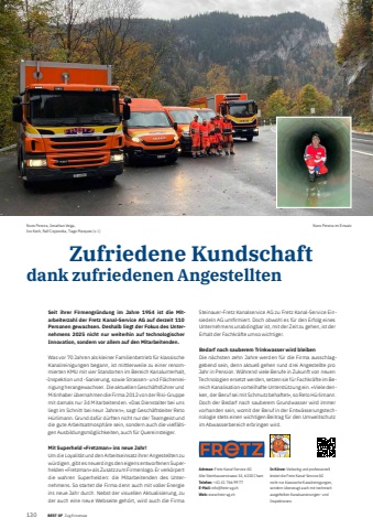 130 BEST OF BEST OF Zug Ennetsee Portrait xxx Zufriedene Kundschaftdank zufriedenen Angestellten Adresse: Fretz Kanal-Service AGAlte Steinhauserstrasse 34, 6330 ChamTelefon: +41 41 766 99 77E-Mail: info@fretz-ag.chWeb: www.fretz-ag.chIn K%u00fcrze: Vielseitig und professionell leistet die Fretz Kanal-Service AG nicht nur klassische Kanalreinigungen, sondern %u00fcberzeugt auch mit technisch ausgefeilten Kanalsanierungen- und Inspektionen. Seit ihrer Firmengr%u00fcndung im Jahre 1954 ist die Mitarbeiterzahl der Fretz Kanal-Service AG auf derzeit 110 Personen gewachsen. Deshalb liegt der Fokus des Unternehmens 2025 nicht nur weiterhin auf technologischer Innovation, sondern vor allem auf den Mitarbeitenden. Was vor 70 Jahren als kleiner Familienbetrieb f%u00fcr klassische Kanalreinigungen begann, ist mittlerweile zu einer renommierten KMU mit vier Standorten im Bereich Kanalunterhalt, -Inspektion und -Sanierung, sowie Strassen- und Fl%u00e4chenreinigung herangewachsen. Die aktuellen Gesch%u00e4ftsf%u00fchrer und Mitinhaber %u00fcbernahmen die Firma 2012 von der Risi-Gruppe mit damals nur 34 Mitarbeitenden. %u00abDas Dienstalter bei uns liegt im Schnitt bei neun Jahren%u00bb, sagt Gesch%u00e4ftsleiter Reto H%u00fcrlimann. Grund daf%u00fcr d%u00fcrften nicht nur der Teamgeist und die gute Arbeitsatmosph%u00e4re sein, sondern auch die vielf%u00e4ltigen Ausbildungsm%u00f6glichkeiten, auch f%u00fcr Quereinsteiger. Mit Superheld %u00abFretzman%u00bb ins neue Jahr!Um die Loyalit%u00e4t und den Arbeitseinsatz ihrer Angestellten zu w%u00fcrdigen, gibt es neuerdings den eigens entworfenen Superhelden %u00abFretzman%u00bb als Zusatz zum Firmenlogo. Er verk%u00f6rpert die wahren Superhelden: die Mitarbeitenden des Unternehmens. So startet die Firma denn auch mit voller Energie ins neue Jahr durch. Nebst der visuellen Aktualisierung, zu der auch eine neue Webseite geh%u00f6rt, wird auch die Firma Steinauer-Fretz Kanalservice AG zu Fretz Kanal-Service Einsiedeln AG umfi rmiert. Doch obwohl es f%u00fcr den Erfolg eines Unternehmens unabdingbar ist, mit der Zeit zu gehen, ist der Erhalt der Fachkr%u00e4fte umso wichtiger. Bedarf nach sauberem Trinkwasser wird bleiben Die n%u00e4chsten zehn Jahre werden f%u00fcr die Firma ausschlaggebend sein, denn aktuell gehen rund drei Angestellte pro Jahr in Pension. W%u00e4hrend viele Berufe in Zukunft von neuen Technologien ersetzt werden, setzen sie f%u00fcr Fachkr%u00e4fte im Bereich Kanalisation vorteilhafte Unterst%u00fctzung ein. %u00abViele denken, der Beruf sei mit Schmutz behaftet%u00bb, so Reto H%u00fcrlimann. Doch der Bedarf nach sauberem Grundwasser wird immer vorhanden sein, womit der Beruf in der Entw%u00e4sserungstechnologie stets einen wichtigen Beitrag f%u00fcr den Umweltschutz im Abwasserbereich erbringen wird.Nuno Pereira, Jonathan Veiga, Ivo Koch, Ralf Czypionka, Tiago Marques (v. l.)Nuno Pereira im Einsatzfretz-ag.chUNSERE KANALHELDENRETTEN IHRE ABFL%u00dcSSE!KanalunterhaltKanalinspektionKanalsanierungStrassen- und Fl%u00e4chenreinigungFretz Kanal-Service AG Alte Steinhauserstrasse 34 6330 Cham 041 766 99 77