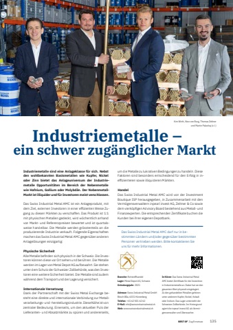 BEST OF BEST OF Zug Ennetsee Portrait xxx 1352 Industriemetalle %u2013 ein schwer zug%u00e4nglicher MarktIndustriemetalle sind eine Anlageklasse f%u00fcr sich. Nebst den wohlbekannten Basismetallen wie Kupfer, Nickel oder Zinn bietet das Anlageuniversum der Industriemetalle Opportunit%u00e4ten im Bereich der Nebenmetalle wie Hafnium, Gallium oder Molybd%u00e4n. Der NebenmetallMarkt ist illiquider und f%u00fcr Investoren meist verschlossen.Das Swiss Industrial Metal AMC ist ein Anlageprodukt, mit dem Ziel, externen Investoren in einer effi zienten Weise Zugang zu diesen M%u00e4rkten zu verschaffen. Das Produkt ist 1:1 mit physischen Metallen gedeckt, wird w%u00f6chentlich anhand von Markt- und Referenzpreisen bewertet und ist quartalsweise handelbar. Die Metalle werden gr%u00f6sstenteils an die produzierende Industrie verkauft. Folgende Eigenschaften machen das Swiss Industrial Metal AMC gegen%u00fcber anderen Anlagel%u00f6sungen einzigartig:Physische SicherheitAlle Metalle befi nden sich physisch in der Schweiz. Die Investoren k%u00f6nnen diese vor Ort sehen und ber%u00fchren. Die Metalle werden im Lager von Metal Depot AG aufbewahrt. Sie stehen unter dem Schutz der Schweizer Zollbeh%u00f6rde, was den Investoren eine weitere Sicherheit bietet. Die Metalle sind zudem w%u00e4hrend dem Transport und der Lagerung versichert.Internationale VernetzungDank der Partnerschaft mit der Swiss Metal Exchange besteht eine direkte und internationale Verbindung zur Metallverarbeitungs- und -herstellungsindustrie. Diese N%u00e4he ist von zentraler Bedeutung. Einerseits, um den aktuellen Puls der Lieferanten- und Absatzm%u00e4rkte zu sp%u00fcren und andererseits, um die Metalle zu lukrativen Bedingungen zu handeln. Diese Faktoren sind besonders entscheidend f%u00fcr den Erfolg in ineffi zienteren sowie illiquideren M%u00e4rkten.HandelDas Swiss Industrial Metal AMC wird von der Investment Boutique ISP herausgegeben, in Zusammenarbeit mit den Verm%u00f6gensverwaltern inpearl invest AG, Zeltner & Co sowie dem vierk%u00f6pfi gen Advisory Board bestehend aus Metall- und Finanzexperten. Die entsprechenden Zertifi kate buchen die Kunden bei ihrer eigenen Depotbank.Branche: RohstoffhandelLager: Metal Depot AG, SchweizGr%u00fcndungsjahr: 2021Adresse: Swiss Industrial Metal GmbHB%u00f6sch 80a, 6331 H%u00fcnenbergTelefon: +41 62 501 62 62E-Mail: info@swissindustrialmetal.chWeb: www.swissindustrialmetal.chIn K%u00fcrze: Das Swiss Industrial Metal AMC bietet Zertifi kate f%u00fcr die Investition in Industriemetalle an. Dabei hat sie den gesamten Wert physisch eingelagert. Zu den gehandelten Metallen geh%u00f6ren unter anderem Kupfer, Nickel, Kobalt oder Indium. Das Lager untersteht der Schweizer Zollbeh%u00f6rde. Im Hintergrund agiert die inpearl invest AG als Verm%u00f6gensverwalter und %u00dcberwacher.Das Swiss Industrial Metal AMC darf nur in bestimmten L%u00e4ndern und/oder gegen%u00fcber bestimmten Personen vertrieben werden. Bitte kontaktieren Sie uns f%u00fcr mehr Informationen.Kim Wirth, Nico von Burg, Thomas Zeltner und Martin Palushaj (v. l.)