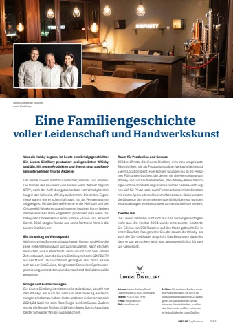 BEST OF BEST OF Zug Ennetsee Portrait xxx 1371 Eine Familiengeschichte voller Leidenschaft und HandwerkskunstAdresse: Liwero Distillery GmbHChamerstrasse 11, 6331 H%u00fcnenbergTelefon: +41 76 303 19 93E-Mail: info@liwero.chWeb: www.liwero.chIn K%u00fcrze: Mit der Liwero Distillery wurde eine Marke geschaffen, die sich in der Spirituosenszene etabliert hat. Zu kaufen gibt es die Spezialit%u00e4ten bei Zentralschweizer Getr%u00e4nkeh%u00e4ndlern, in zahlreichen Restaurants und Bars, online oder im Verkaufsladen der Liwero Distillery.Was als Hobby begann, ist heute eine Erfolgsgeschichte: Die Liwero Distillery produziert preisgekr%u00f6nten Whisky und Gin. Mit neuen Produkten und Events setzt das Familienunternehmen frische Akzente.Der Name Liwero steht f%u00fcr Limacher, Werner und Roman: Die Namen des Gr%u00fcnders und dessen Sohn. Werner begann 1999, nach der Aufhebung des Verbots von Whiskyherstellung in der Schweiz, Whisky zu brennen. Die ersten Ergebnisse waren, wie er scherzhaft sagt, nur als Fensterputzmittel geeignet. Mit der Zeit verfeinerte er die Methode und der ChickenHill Whisky entstand in seiner heutigen Form. Neben dem klassischen Rare Single Malt produziert die Liwero Distillery den ChickenHill in einer Smoke Edition und als Port Barrel. 2018 stiegen Roman und seine Partnerin Aline in die Liwero Distillery ein.Ein Strandtag als WendepunktW%u00e4hrend eines Sommerurlaubs hatten Roman und Aline die Idee, neben Whisky auch Gin zu produzieren. Nach etlichen Versuchen, was in etwa 1500 Litern Gin und rund zwei Jahren Zeit entsprach, kam die Liwero Distillery mit dem GINFINITY auf den Markt. Der Durchbruch gelang im Jahr 2022, als sie sich bei der DistiSuisse, der gr%u00f6ssten Schweizer Spirituosenpr%u00e4mierung anmeldeten und %u00fcberraschend die Goldmedaille gewannen. Erfolge und AuszeichnungenDie Liwero Distillery ist mittlerweile stolz darauf, sowohl mit den Whiskys als auch mit dem Gin %u00fcber zwanzig Auszeichnungen erhalten zu haben. Unter anderem sicherten sie sich 2023/24 Gold mit dem Rare Single bei DistiSuisse. Zudem wurde die Smoke Edition 2018 beim Swiss Spirits Award als bester Schweizer Whisky ausgezeichnet. Raum f%u00fcr Produktion und Genuss2024 er%u00f6ffnete die Liwero Distillery eine neu umgebaute R%u00e4umlichkeit, die als Produktionsst%u00e4tte, Verkaufsfl%u00e4che und Event-Location dient. Hier k%u00f6nnen Gruppen bis zu 30 Personen F%u00fchrungen buchen, bei denen sie die Herstellung von Whisky und Gin hautnah erleben, den Whisky-Keller besichtigen und die Produkte degustieren k%u00f6nnen. Diese Events eignen sich f%u00fcr Privat- oder auch Firmenanl%u00e4sse in Kombination mit einem Ap%u00e9ro oder exklusiven Abendessen. Dabei werden die G%u00e4ste von den Unternehmern pers%u00f6nlich betreut, was den Veranstaltungen eine besondere, authentische Note verleiht.Zweiter Gin Die Liwero Distillery ruht sich auf den bisherigen Erfolgen nicht aus. Im Herbst 2024 wurde eine zweite, limitierte Gin-Edition von 350 Flaschen auf den Markt gebracht: Ein in einem Bourbon-Fass gereifter Gin, der sowohl die Whisky- als auch die Gin-Liebhaber anspricht. Das Besondere daran ist, dass er pur getrunken wird, was aussergew%u00f6hnlich f%u00fcr den Gin-Genuss ist.Roman und Werner Limacher sowie Aline Kaspar