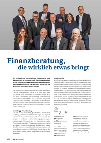 138 BEST OF BEST OF Zug Ennetsee Portrait xxxFinanzberatung, die wirklich etwas bringtIm Dschungel der verschiedenen Versicherungs- und Bankangebote ist es schwierig, die %u00dcbersicht zu behalten. Ja fast unm%u00f6glich, das Beste zu fi nden. Daf%u00fcr gibt es unabh%u00e4ngige Finanzberater, die den Markt kennen und die Kundschaft bed%u00fcrfnisorientiert beraten. Das Zentrum f%u00fcr unabh%u00e4ngige Finanberatung ZUF wurde im Oktober 2009 gegr%u00fcndet. Seither ist es stetig gewachsen, so dass das Team mittlerweile elf Personen umfasst. Acht von ihnen %u00fcbernehmen die unabh%u00e4ngige Finanzberatung f%u00fcr Privatpersonen und KMU. Daf%u00fcr sind sie in der ganzen Deutschschweiz unterwegs. Die anderen Drei widmen sich den Bereichen Treuhand und dem Backoffi ce. Bei ihnen wird die Kundschaft herzlich in den B%u00fcror%u00e4umlichkeiten oder am Telefon empfangen.Unabh%u00e4ngige FinanzberatungDas Ziel ist eine umfassende, ganzheitliche Finanzanalyse, unabh%u00e4ngig von Banken und Versicherungen. Im Gespr%u00e4ch werden die Kundenbed%u00fcrfnisse und Ziele evaluiert. Dabei geht es um Steuer- und Versicherungsoptimierungen, Kapital anlagen, Finanzierungen von Wohneigentum oder Pensionsplanungen. Die Finanzberater kennen den Markt, sind jedoch nicht an Produkte oder Gesellschaften gebunden. Sie arbeiten mit praktisch allen Versicherungen und vielen Banken zusammen. Ziel ist es, der Kundschaft die best m%u00f6gliche L%u00f6sung und die bed%u00fcrfnisgerechten Produkte anzubieten.KundenvorteileEine Zusammenarbeit mit dem Zentrum f%u00fcr unabh%u00e4ngige Finanberatung ZUF hat f%u00fcr die Kundschaft viele Vorteile. Einerseits kann sie sicher sein, unabh%u00e4ngig betreut zu werden %u2013 es werden keine unn%u00f6tigen Produkte aufgedr%u00e4ngt. Andererseits profi tiert sie von einer Auswahl an Produkten verschiedener Gesellschaften und Finanzinstitute. Gleichzeitig gibt es gesellschafts%u00fcbergreifend nur einen Berater, ein ganz pers%u00f6nlicher Finanzberater vom Zentrum f%u00fcr unabh%u00e4ngige Finanberatung ZUF. Da sich die Bedingungen und die Bed%u00fcrfnisse im Laufe des Lebens %u00e4ndern und entsprechend angepasst werden sollten, entsteht vielfach eine Beziehung auf Lebzeiten. Dies geschieht jederzeit pers%u00f6nlich, kompetent und themen%u00fcbergreifend. Gr%u00fcndungsjahr: 2009Team: 11 PersonenEinzugsgebiet: DeutschschweizDienstleistung: Unabh%u00e4ngige FinanzberatungAdresse: ZUF Zentrum f%u00fcr unabh%u00e4ngige FinanzberatungBoesch 37, 6331 H%u00fcnenbergTelefon: +41 41 444 30 10E-Mail: info@zuf-fi nanz.chWeb: www.zuf-fi nanz.chIn K%u00fcrze: Mit einem pers%u00f6nlichen Finanzberater vom Zentrum f%u00fcr unabh%u00e4ngige Finanberatung ZUF erhalten Kundinnen und Kunden die Finanz beratung, die ihnen wirklich etwas bringt. Die Finanzberater fi nden f%u00fcr ihre Kundschaft die bestm%u00f6gliche L%u00f6sung im Bereich Versicherungs- und Steuer optimierung, Kapitalanlage, Finanzierung oder Pensionsplanung.
