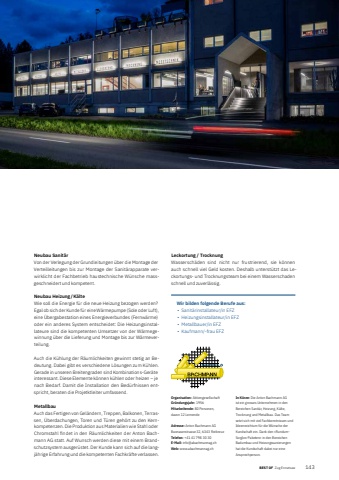 BEST OF BEST OF Zug Ennetsee Portrait xxx 1432Organisation: AktiengesellschaftGr%u00fcndungsjahr: 1956Mitarbeitende: 80 Personen, davon 12 LernendeAdresse: Anton Bachmann AGBuonaserstrasse 32, 6343 RotkreuzTelefon: +41 41 798 30 30E-Mail: info@abachmannag.chWeb: www.abachmannag.chIn K%u00fcrze: Die Anton Bachmann AG ist ein grosses Unternehmen in den Bereichen Sanit%u00e4r, Heizung, K%u00e4lte, Trocknung und Metallbau. Das Team setzt sich mit viel Fachkenntnissen und Ideenreichtum f%u00fcr die W%u00fcnsche der Kundschaft ein. Dank den %u00abRundumSorglos-Paketen%u00bb in den Bereichen Badumbau und Heizungssanierungen hat die Kundschaft dabei nur eine Ansprechperson. Neubau Sanit%u00e4r Von der Verlegung der Grundleitungen %u00fcber die Montage der Verteilleitungen bis zur Montage der Sanit%u00e4rapparate verwirklicht der Fachbetrieb haustechnische W%u00fcnsche massgeschneidert und kompetent.Neubau Heizung / K%u00e4lte Wie soll die Energie f%u00fcr die neue Heizung bezogen werden? Egal ob sich der Kunde f%u00fcr eine W%u00e4rmepumpe (Sole oder Luft), eine %u00dcbergabestation eines Energieverbundes (Fernw%u00e4rme) oder ein anderes System entscheidet: Die Heizungsinstallateure sind die kompetenten Umsetzer von der W%u00e4rmegewinnung %u00fcber die Lieferung und Montage bis zur W%u00e4rmeverteilung. Auch die K%u00fchlung der R%u00e4umlichkeiten gewinnt stetig an Bedeutung. Dabei gibt es verschiedene L%u00f6sungen zum K%u00fchlen. Gerade in unseren Breitengraden sind Kombinations-Ger%u00e4te interessant. Diese Elemente k%u00f6nnen k%u00fchlen oder heizen %u2013 je nach Bedarf. Damit die Installation den Bed%u00fcrfnissen entspricht, beraten die Projetktleiter umfassend. MetallbauAuch das Fertigen von Gel%u00e4ndern, Treppen, Balkonen, Terrassen, %u00dcberdachungen, Toren und T%u00fcren geh%u00f6rt zu den Kernkompetenzen. Die Produktion aus Materialien wie Stahl oder Chromstahl fi ndet in den R%u00e4umlichkeiten der Anton Bachmann AG statt. Auf Wunsch werden diese mit einem Brandschutzsystem ausger%u00fcstet. Der Kunde kann sich auf die langj%u00e4hrige Erfahrung und die kompetenten Fachkr%u00e4fte verlassen.Leckortung / TrocknungWassersch%u00e4den sind nicht nur frustrierend, sie k%u00f6nnen auch schnell viel Geld kosten. Deshalb unterst%u00fctzt das Leckortungs- und Trocknungsteam bei einem Wasserschaden schnell und zuverl%u00e4ssig. Wir bilden folgende Berufe aus:%u2022 Sanit%u00e4rinstallateur/in EFZ%u2022 Heizungsinstallateur/in EFZ%u2022 Metallbauer/in EFZ%u2022 Kaufmann/-frau EFZ