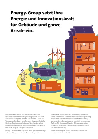 144 BEST OF xxxEin Geb%u00e4ude entwickelt sich heute zunehmend zum relevanten Element im k%u00fcnftigen Energiesystem und wird damit zum verl%u00e4ngerten Arm des Stromnetzes %u2013 sei es als Verbraucher, Produzent oder Speicher. Die gesamtheitliche Sicht von Geb%u00e4uden und Netzen auf dem Handlungsfeld der Zielnetzplanung wird damit zum wichtigen Werkzeug in der Umsetzung der Energiestrategie 2050.Energy-Group setzt ihre Expertise, ihren grossen Erfahrungsschatz und ihre Innovationskraft darum l%u00e4ngst nicht nur f%u00fcr einzelne Geb%u00e4ude ein. Wir entwickeln ganze Areale, wobei die einzelnen Kompetenzbereiche interdisziplin%u00e4r eng miteinander zusammenarbeiten. Dabei f%u00e4llt der Planung des gesamten Lebenszyklus einer Immobilie eine tragende Rolle zu. Mit einer ausgekl%u00fcgelten Geb%u00e4udeautomation reduzieren wir den CO2-Ausstoss und unterst%u00fctzen damit die Dekarbonisierung. Wenn es darum geht, unsere L%u00f6sungen zu verbessern, machen wir nie einen Punkt.Energy-Group setzt ihre Energie und Innovationskraft f%u00fcr Geb%u00e4ude und ganze Areale ein.
