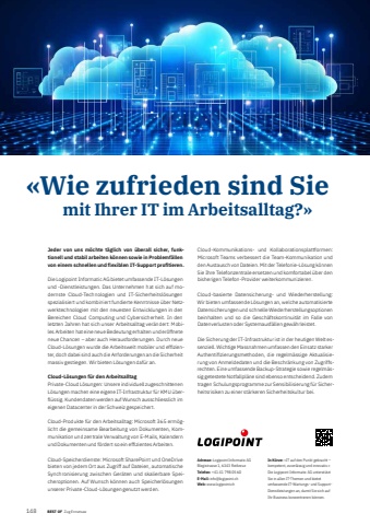 148 BEST OF BEST OF Zug Ennetsee Portrait xxx%u00abWie zufrieden sind Sie mit Ihrer IT im Arbeitsalltag?%u00bbJeder von uns m%u00f6chte t%u00e4glich von %u00fcberall sicher, funktionell und stabil arbeiten k%u00f6nnen sowie in Problemf%u00e4llen von einem schnellen und flexiblen IT-Support profi tieren.Die Logipoint Informatic AG bietet umfassende IT- L%u00f6sungen und -Dienstleistungen. Das Unternehmen hat sich auf modernste Cloud-Technologien und IT-Sicherheitsl%u00f6sungen spezialisiert und kombiniert fundierte Kenntnisse %u00fcber Netzwerktechnologien mit den neuesten Entwicklungen in den Bereichen Cloud Computing und Cybersicherheit. In den letzten Jahren hat sich unser Arbeitsalltag ver%u00e4ndert: Mobiles Arbeiten hat eine neue Bedeutung erhalten und er%u00f6ffnete neue Chancen %u2013 aber auch Herausforderungen. Durch neue Cloud-L%u00f6sungen wurde die Arbeitswelt mobiler und effi zienter, doch dabei sind auch die Anforderungen an die Sicherheit massiv gestiegen. Wir bieten L%u00f6sungen daf%u00fcr an.Cloud-L%u00f6sungen f%u00fcr den ArbeitsalltagPrivate-Cloud L%u00f6sungen: Unsere individuell zugeschnittenen L%u00f6sungen machen eine eigene IT- Infrastruktur f%u00fcr KMU %u00fcberfl%u00fcssig. Kundendaten werden auf Wunsch ausschliesslich im eigenen Datacenter in der Schweiz gespeichert.Cloud-Produkte f%u00fcr den Arbeitsalltag: Microsoft 365 erm%u00f6glicht die gemeinsame Bearbeitung von Dokumenten, Kommunikation und zentrale Verwaltung von E-Mails, Kalendern und Dokumenten und f%u00f6rdert so ein effi zientes Arbeiten.Cloud-Speicherdienste: Microsoft SharePoint und One Drive bieten von jedem Ort aus Zugriff auf Dateien, automatische Synchronisierung zwischen Ger%u00e4ten und skalierbare Speicheroptionen. Auf Wunsch k%u00f6nnen auch Speicherl%u00f6sungen unserer Private-Cloud-L%u00f6sungen genutzt werden.Cloud-Kommunikations- und Kollaborationsplattformen: Microsoft Teams verbessert die Team-Kommunikation und den Austausch von Dateien. Mit der Telefonie-L%u00f6sung k%u00f6nnen Sie Ihre Telefonzentrale ersetzen und komfortabel %u00fcber den bisherigen Telefon-Provider weiterkommunizieren.Cloud-basierte Datensicherung- und Wiederherstellung: Wir bieten umfassende L%u00f6sungen an, welche automatisierte Datensicherungen und schnelle Wiederherstellungs optionen beinhalten und so die Gesch%u00e4ftskontinuit%u00e4t im Falle von Datenverlusten oder Systemausf%u00e4llen gew%u00e4hrleistet.Die Sicherung der IT-Infrastruktur ist in der heutigen Welt essenziell. Wichtige Massnahmen umfassen den Einsatz starker Authentifi zierungsmethoden, die regelm%u00e4ssige Aktualisierung von Anmeldedaten und die Beschr%u00e4nkung von Zugriffsrechten. Eine umfassende Backup-Strategie sowie regelm%u00e4ssig getestete Notfallpl%u00e4ne sind ebenso entscheidend. Zudem tragen Schulungsprogramme zur Sensibilisierung f%u00fcr Sicherheitsrisiken zu einer st%u00e4rkeren Sicherheitskultur bei.Adresse: Logipoint Informatic AG Blegistrasse 1, 6343 RotkreuzTelefon: +41 41 798 05 60E-Mail: info@logipoint.ch Web: www.logipoint.chIn K%u00fcrze: %u00abIT auf den Punkt gebracht %u2013 kompetent, zuverl%u00e4ssig und innovativ.%u00bb Die Logipoint Informatic AG unterst%u00fctzt Sie in allen IT-Themen und bietet umfassende IT-Wartungs- und SupportDienstleistungen an, damit Sie sich auf Ihr Business konzentrieren k%u00f6nnen.