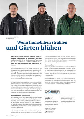 150 BEST OF BEST OF Zug Ennetsee Portrait xxxDober Facility Services %u00fcberzeugt seit sechs Jahren als vielseitige Dienstleisterin im Reinigungs-, Unterhaltsund Gartenbereich. Mit der Kombination aus Fachwissen, innovativen Ans%u00e4tzen und pers%u00f6nlicher N%u00e4he zur Kundschaft setzt das Unternehmen neue Massst%u00e4be in der Branche.Die Firma zeichnet sich durch ein breites Portfolio aus. Neben klassischen Hauswartungsdiensten, Unterhalts- und Endreinigungen wird auch Wert auf weiterf%u00fchrende Dienstleistungen und individuelle Gartenpflege gelegt. Damit Immobilien ihren Wert erhalten, wird proaktiv auf Sch%u00e4den oder Schwachstellen hingewiesen und diese nach R%u00fccksprache mit der Kundschaft fachgerecht repariert.Die Dober Facility Services arbeitet eng mit renommierten Immobilienmaklern und -verwaltungen zusammen und betreut sowohl private als auch gewerbliche Kundschaft. Jede Aufgabe wird mit einem hohen Servicegedanken erf%u00fcllt, der %u00fcber die %u00fcbliche Aufgabe hinausgeht. Diese %u00dcberzeugung hat dem Unternehmen einen exzellenten Ruf eingebracht, sodass es auf ein stetiges Wachstum blicken kann. Nachhaltig, flexibel, lokal verankert Die Flexibilit%u00e4t und die N%u00e4he zu den Kundinnen und Kunden sind zentrale Elemente, die es Dober Facility Services erm%u00f6glichen, auch kurzfristige Anfragen effi zient zu bearbeiten. Besonderen Wert legt die Firma auf einen lockeren und pers%u00f6nlichen Umgang. %u00dcber moderne Kommunikationswege und durch eine flache Hierarchie werden Anfragen rasch und kompetent beantwortet. Auch im Gartenbereich wurden neue Dienstleistungen eingef%u00fchrt. Unter der Leitung von Marcel Gloor bl%u00fchen G%u00e4rten und Terrassenbepflanzungen auf oder erhalten den fachgerechten Winterschnitt. Dass dabei %u00f6kologische L%u00f6sungen ohne Einsatz von Giftstoffen zum Tragen kommen, zeigt die innovative Ausrichtung des Unternehmens. Ein starkes Team Das Facility-Institut wird vom Gr%u00fcnder und Gesch%u00e4ftsf%u00fchrer Florian Dober und seinem Stellvertreter Stefan Rast gef%u00fchrt. Sie pflegen ein enges Netzwerk mit der Kundschaft und Partnerfi rmen. Gemeinsam schaffen die beiden eine ideale Synergie zwischen Backoffi ce-Management und operativer Pr%u00e4senz vor Ort. Das Team besteht aus elf Voll- und Teilzeit-Mitarbeitenden. Damit bleibt das Unternehmen bewusst famili%u00e4r. Jeder Mitarbeitende ist ein wertvolles Mitglied, wobei grossen Wert auf eine vertrauensvolle Zusammenarbeit gelegt wird. Wenn Immobilien strahlenund G%u00e4rten bl%u00fchenGr%u00fcndungsjahr: 2018Mitarbeitende: 11Dienstleistungen: Unterhaltsund Endreinigungen, Wartungen und Instandsetzungen von Immobilien sowie Gartenpflege und -beratungenAdresse: Dober Facility ServicesHofmatt 10, 6332 HagendornTelefon: +41 41 711 51 08E-Mail: info@dober-fs.chWeb: www.dober-fs.chIn K%u00fcrze: Ob saubere R%u00e4ume, perfekt gepflegte G%u00e4rten oder schnelle L%u00f6sungen f%u00fcr Immobilien: Dober Facility Services steht f%u00fcr zuverl%u00e4ssigen Service mit pers%u00f6nlicher Note.Stv. Stefan Rast, CEO Florian Doberund Marcel Gloor (v. l.)