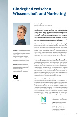 BEST OF Aus der Nachbarschaft 161Adresse:Nyffeler Scientifi c Marketing GmbHKreuzackerweg 281, 4574 L%u00fcsslingen SO Telefon: +41 79 232 30 04E-Mail: nyffeler@nyffeler-scientifi c.chWeb: nyffeler-scientifi c.ch In K%u00fcrze: Die Nyffeler Scientifi c Marketing GmbH verbindet pr%u00e4zises wissenschaftliches Verst%u00e4ndnis mit kreativen Marketingmethoden.Dr. Myriel NyffelerNeurobiologin und UnternehmerinDie Nyffeler Scientifi c Marketing GmbH ist spezialisiert auf wissenschaftlich basiertes Marketing. Das Unternehmen bietet eine breite Palette von Dienstleistungen an, darunter die Erstellung von digitalen Inhalten und medizinischer Fachkommunikation, Schulungen f%u00fcr den Aussendienst sowie ad interim Eins%u00e4tze zur Projektunterst%u00fctzung. Die Zielsetzung der Firma ist es, wissenschaftliche Inhalte durch strategisches Marketing und klare Kommunikation wirkungsvoll zu vermarkten.Wie kamen Sie als promovierte Neurobiologin zum Marketing? Wissenschaftskommunikation hat mich schon immer fasziniert. Nach dem Doktorat wollte ich diese gezielt einsetzen. Mein Wissen habe ich durch verschiedene Marketing- und Medical Affairs-Positionen sowohl in der Medtech- als auch in der Pharmabranche vertieft. Mein Ansatz des %u00abScientifi c Marketing%u00bb verbindet pr%u00e4zises wissenschaftliches Verst%u00e4ndnis mit kreativen Marketingmethoden, um sowohl Fachpublikum als auch Endkund:innen zu erreichen. Je nach Zielpublikum muss man die richtige Flugh%u00f6he treffen. Ja. Ich arbeite oft mit medizinischem Fachpersonal zusammen und wirke als Bindeglied zwischen dem medizinischen und MarketingTeam. Meine Expertise als promovierte Neurobiologin und meine Erfahrung im Marketing erm%u00f6glichen mir, zwischen verschiedenen Tonalit%u00e4ten und Wissensst%u00e4nden zu navigieren und so eine wissenschaftlich fundierte und gleichzeitig allgemein verst%u00e4ndliche Kommunikation auf der %u00abrichtigen Flugh%u00f6he%u00bb zu gew%u00e4hrleisten. Je nach Kund:in realisiere ich Unternehmens- oder Produktwebseiten, Webinare, Podcasts, Social Media Kampagnen und Printmaterialien bis hin zu Verkaufstrainings f%u00fcr den Aussendienst.Was zeichnet Ihre Arbeitsweise aus? Ich verfolge einen partnerschaftlichen Ansatz, der darauf abzielt, die individuellen Bed%u00fcrfnisse der Kundschaft zu verstehen und massgeschneidert L%u00f6sungen zu entwickeln. Dabei werde ich zeitweise Teil des Teams und arbeite eng mit den verschienenen Abteilungen zusammen. Eine meiner St%u00e4rken ist, dass ich schnell das Wesentliche einer wissenschaftlichen Studie verstehen kann. Dies sehe ich als Grundlage f%u00fcr die weitere Projektgestaltung. Durch meine Erfahrung weiss ich auch, welche Tools funktionieren und welche nicht, um komplexe Inhalte verst%u00e4ndlich und aussagekr%u00e4ftig darzustellen.Zur Person: Dr. Myriel Nyffeler ist promovierte Neurobiologin und Unternehmerin mit bald 20%u00a0Jahren Erfahrung im %u00abScientifi c Marketing%u00bb. Nach ihrer akade mischen Laufbahn sammelte sie umfassende Erfahrungen in internationalen Positionen in der Medizintechnik- und Pharmabranche, wo sie sich auf die Schnittstelle zwischen Wissenschaft und Marketing konzentrierte.Werdegang: Studium und Dissertation an der ETH Z%u00fcrich sowie teilweise im Ausland, Weiterbildung im Bereich Marketing an der Universit%u00e4t St. Gallen (HSG)Freizeit: Treibt gerne Sport, interessiert sich f%u00fcr Wein und geniesst das FamilienlebenBindeglied zwischen Wissenschaft und MarketingZum LinkedIn-Profi l