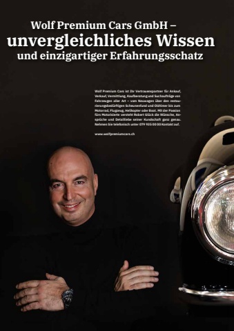 1 BEST OF Portrait xxxWolf Premium Cars ist Ihr Vertrauenspartner f%u00fcr Ankauf, Verkauf, Vermittlung, Kaufberatung und Suchauftr%u00e4ge von Fahrzeugen aller Art %u2013 vom Neuwagen %u00fcber den restaurierungsbed%u00fcrftigen Scheunenfund und Oldtimer bis zum Motorrad, Flugzeug, Helikopter oder Boot. Mit der Passion f%u00fcrs Motorisierte versteht Robert Gl%u00fcck die W%u00fcnsche, Anspr%u00fcche und Detailliebe seiner Kundschaft ganz genau. Nehmen Sie telefonisch unter 079 935 00 00 Kontakt auf.www.wolfpremiumcars.ch Wolf Premium Cars GmbH %u2013unvergleichliches Wissen und einzigartiger Erfahrungsschatz