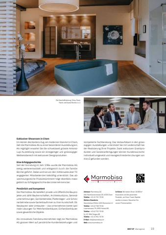 BEST OF BEST OF %u00dcberregional Portrait xxx 232Adresse: Marmobisa AGAlte Steinhauserstrasse 20, 6330 ChamTelefon: +41 41 741 70 50 Weitere Standorte:Gewerbehaus M%u00fchle, 6245 Ebersecken LUTelefon: +41 62 748 70 50Luzernstrasse 79, 4950 Huttwil BETelefon: +41 62 752 70 50Ey 19, 3063 Ittigen BETelefon: +41 31 931 70 70E-Mail: info@marmobisa.chWeb: www.marmobisa.chIn K%u00fcrze: Wir bieten Ihnen 10 000 m2Inspiration und die passenden Produkte, um Ihren Traum Realit%u00e4t werden zu lassen. Besuchen Sie unsere Themenwelten.Exklusiver Showroom in ChamIm Herzen des Kantons Zug, am modernen Standort in Cham, l%u00e4dt die Marmobisa AG zu einer besonderen Ausstellung ein. Als Highlight erwartet Sie die schweizweit gr%u00f6sste AntonioLupi-Ausstellung sowie ein einzigartiger und grossz%u00fcgiger Wellnessbereich mit exklusiven Designprodukten.Eine ErfolgsgeschichteSeit der Gr%u00fcndung im Jahr 1986 wurde die Marmobisa AG stetig weiterentwickelt und erfolgreich durch die Familie Bircher gef%u00fchrt. Dabei wird sie von den mittlerweile %u00fcber 70 engagierten Mitarbeitenden tatkr%u00e4ftig unterst%u00fctzt. Das abwechslungsreiche Produktsortiment tr%u00e4gt ebenfalls massgeblich zur Erfolgsgeschichte des Unternehmens bei.Pers%u00f6nlich und kompetentDie Marmobisa AG beliefert private und %u00f6ffentliche Bauprojekte und z%u00e4hlt Bauherrschaften, Architekturb%u00fcros, Generalunternehmungen, Sanit%u00e4rbetriebe, Plattenleger- und Schreinerbetriebe sowie Gartenbaufi rmen zu ihrer Kundschaft. Ob Neubauten oder Umbauten %u2013 das Unternehmen bietet optimale L%u00f6sungen f%u00fcr Mehrfamilienh%u00e4user, Einfamilienh%u00e4user sowie gewerbliche Objekte.Als innovatives Familienunternehmen legt die Marmobisa AG grossen Wert auf pers%u00f6nliche Kundenbeziehungen und kompetente Fachberatung. Das Verkaufsteam in den grossz%u00fcgigen Ausstellungen unterst%u00fctzt Sie mit Leidenschaft bei der Realisierung Ihrer Projekte. Dank exklusiven Granitprodukten und Sonderanfertigungen k%u00f6nnen Kundenw%u00fcnsche individuell umgesetzt und massgeschneiderte L%u00f6sungen von A bis Z gefunden werden.Die Gesch%u00e4ftsleitung: Silvia, Ren%u00e9, Patrik und Daniel Bircher (v. l.)
