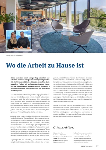 BEST OF BEST OF %u00dcberregional Portrait xxx 291Wo die Arbeit zu Hause istAdresse: .kuia.offi ce.Neuhofstrasse 12, 6340 BaarHinterbergstrasse 16, 6312 SteinhausenTelefon: +41 41 767 04 04E-Mail: kontakt@kuia-offi ce.chWeb: www.kuia-offi ce.chIn K%u00fcrze: Sie planen professionell, sind initiativ, f%u00fchren aktiv, handeln agil %u2013 auch bei der Wahl Ihres Arbeitsortes. Wir haben .kuia.offi ce. entwickelt, die flexible B%u00fcrol%u00f6sung, gross oder klein, die so dynamisch ist, wie Sie selbst.Online anmelden, innert weniger Tage einziehen und sofort mit der Arbeit loslegen: So unkompliziert gestaltet sich die Miete von m%u00f6blierten B%u00fcros bei .kuia.offi ce. Dank attraktiven Preisen mit umfassendem Angebot eignen sich die R%u00e4umlichkeiten ausgezeichnet als Firmensitz %u2013 in einer Kombination aus Konzentration und inspirierender Atmosph%u00e4re.Es duftet fein nach Kaffee im stylischen Eingangsbereich, wo man von D%u00e9sir%u00e9e Zahner mit einem %u00abherzlich willkommen%u00bb empfangen wird. Die kuia-Managerin f%u00fchrt Interessierte durch ihr Reich: %u00abWir vermieten B%u00fcror%u00e4umlichkeiten, Sitzungszimmer und bieten auch Co-Working-Spaces%u00bb, bringt sie das Angebot von .kuia.offi ce. der Alfred M%u00fcller AG auf den Punkt. %u00abDoch wir vermieten nicht bloss R%u00e4ume, sondern uns geht es um mehr%u00bb, so D%u00e9sir%u00e9e Zahner. Das B%u00fcrokonzept entspricht der Firmen philosophie. Die hat es in sich ...%u00ab%u2039R%u00e4ume voller Leben%u203a %u2013 dieses Prinzip pr%u00e4gt .kuia.offi ce.%u00bb, erkl%u00e4rt Projektleiter Thomas Fl%u00fctsch. Beim Augenschein vor Ort best%u00e4tigt sich dies. In Steinhausen und Baar herrscht ein lebendiges Nebeneinander von IT-Firmen, Treuh%u00e4ndern, Handelsbetrieben und Vertretungen global agierender Konzerne: %u00abManche m%u00f6gen den t%u00e4glichen Austausch mit anderen Mieter:innen, andere bevorzugen geschlossene T%u00fcren, um konzentriert arbeiten zu k%u00f6nnen%u00bb, so D%u00e9sir%u00e9e Zahner. So unterschiedlich die sozialen Bed%u00fcrfnisse sind, so gibt es doch Gemeinsamkeiten: Alle sch%u00e4tzen die Vorteile bei .kuia.offi ce.Angefangen bei der Anmeldung. Diese kann auf Wunsch komplett online abgewickelt werden. %u00abZudem sind wir transThomas Fl%u00fctsch und D%u00e9sir%u00e9e Zahnerparent%u00bb, erkl%u00e4rt Thomas Fl%u00fctsch. %u00abDer Mietpreis der einzelnen R%u00e4ume ist auf der Webseite ersichtlich. Abgesehen von Parkplatz und Sitzungszimmer ist alles inklusive, es gibt keine versteckten Kosten.%u00bb Geboten wird viel: Stilvolle M%u00f6blierung, WLAN, Reinigung, Drucker, Postservice, Domizilierung sowie die Mitben%u00fctzung der Gemeinschaftsr%u00e4ume mit Gratiskaffee. Und ein sch%u00f6nes Detail: F%u00fcr Power-Naps steht ein Ruheraum zur Verf%u00fcgung. %u00abSelbstverst%u00e4ndlich kann man die R%u00e4ume nach seinen Vorstellungen gestalten und wenn gew%u00fcnscht auch eigene M%u00f6bel mitbringen%u00bb, so D%u00e9sir%u00e9e Zahner. So wird der Arbeits- zum Lebensraum, in dem man ab und zu auch die Seele baumeln lassen m%u00f6chte ...Auf der lauschigen Dachterrasse geniesst man dann sein Feierabendbier oder das gastronomische Angebot der FoodTrucks. Oder man %u00fcberquert die Strasse und ist in zwei, drei Schritten beim Zugersee %u2013 um sich gehend oder rennend zu erholen und %u00fcber eine aufregende Firmenzukunft nachzudenken. Selbstverst%u00e4ndlich bei .kuia.offi ce.