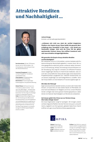 BEST OF BEST OF Stadt Zug Interview 374Adresse: Empira Group Gubelstrasse 32, 6300 ZugTelefon: +41 41 728 75 75E-Mail: info@empira-invest.comWeb: www.empira-invest.comIn K%u00fcrze: Unser Ziel ist es, unseren Investoren weiterhin massgeschneiderte L%u00f6sungen mit nachhaltigen Ertr%u00e4gen zu bieten. Mit der Partners Group haben wir einen starken Partner an unserer Seite und mehr R%u00fcckenwind f%u00fcr unser weiteres Wachstum.Lahcen KnappGr%u00fcnder und Verwaltungsratspr%u00e4sident%u2026 schliessen sich nicht aus, dank der vertikal integrierten Plattform der Empira Group: Diese beh%u00e4lt die gesamte Wertsch%u00f6pfung einer Immobilie in ihrer Hand %u2013 zum Vorteil professioneller Anleger. Jetzt wird die Firma Teil der global operierenden Partners Group. Das er%u00f6ffnet Investoren weltweit neue attraktive Anlagem%u00f6glichkeiten.Wie garantiert die Empira-Group attraktive Renditen und Nachhaltigkeit?Wir investieren nicht nur in Immobilien, sondern behalten alle Prozesse entlang der Wertsch%u00f6pfungskette in unserer Hand. Wir suchen geeignete Grundst%u00fccke, planen und bauen selbst, k%u00fcmmern uns um Vermarktung, Verkauf, Vermietung und anschliessend um die Verwaltung. Das sorgt f%u00fcr schlanke und effi ziente Prozesse. Unser langj%u00e4hriger Develop-to-Hold-Ansatz bedeutet, dass wir nicht den wirtschaftlichen Herausforderungen eines klassischen Projektentwicklers ausgesetzt sind. Vielmehr konzentrieren wir uns darauf, langfristige und nachhaltige Werte zu schaffen. Dar%u00fcber hinaus bieten wir eine Vielzahl an Finanzierungsl%u00f6sungen an.Wie leben Sie F%u00fchrung?Eigenverantwortliches Handeln hat bei uns einen sehr hohen Stellenwert, ich sp%u00fcre bei uns eine starke Hands-on-Mentalit%u00e4t und eine hohe Identifi kation mit T%u00e4tigkeit und Firma. Unsere Mitarbeitenden verf%u00fcgen %u00fcber einen grossen Handlungsspielraum, dabei dienen die Faktoren Nachhaltigkeit und Rendite als Leitplanken. Seit Januar geh%u00f6rt Ihre Firma nun zur Partners Group. Was haben Anleger davon?Die neue Organisation sorgt f%u00fcr Synergien. Wir bringen unsere vertikal integrierte Plattform bei der Partners Group ein und profi -tieren umgekehrt von ihren grossen, globalen Sales Force: Damit er%u00f6ffnen sich ganz neue Markterschliessungspotenziale.Attraktive Renditen und Nachhaltigkeit %u2026Zum Unternehmen: Mit %u00fcber 270 Experten, darunter mehr als 100 Immobilien- und 25%u00a0Kreditexperten, deckt die Empira Group alle relevanten Bereiche ab.Investment Management: Portfoliound Asset-Management, Transaktionen sowie MarktforschungClient Solutions: Produktentwicklung, Kundenbetreuung und MarketingDebt Solutions: Finanzierungsl%u00f6sungen, Kreditmanagement und spezialisierte BeratungGlobale Pr%u00e4senz: Die Empira Group ist an 13 Standorten weltweit vertreten %u2013 davon neun in der DACH-Region %u2013 und betreut %u00fcber 40 Immobilienentwicklungen, vorwiegend in Deutschland. Der Fokus liegt auf nachhaltigen Projekten an erstklassigen Standorten.Vision: Die Empira Group verfolgt ein klares Ziel: Die Entwicklung eines differenzierten Immobilienportfolios, das auf Energieeffi zienz und nachhaltiges Wachstum ausgerichtet ist. Gemeinsam mit der Partners Group werden globale Megatrends wie Dekarbonisierung und %u00abNew Living%u00bb adressiert, um innovative L%u00f6sungen f%u00fcr die Wohnungsnachfrage der Zukunft zu schaffen.