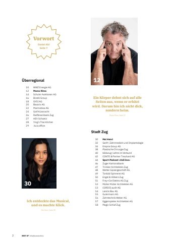 2 BEST OF Inhaltsverzeichnis%u00dcberregional10 WWZ Energie AG12 Marco Rima14 Schuler Auktionen AG16 Binelli Group18 GYSI AG20 Bavorix AG22 Marmobisa AG24 Golf K%u00fcssnacht26 Raiffeisenbank Zug27 HEV Schweiz28 Ying%u2019s Thai Kitchen29 .kuia.office.Stadt Zug30 Mei Henri32 Sanft | Zahnmedizin und Implantologie34 Empira Group AG38 Plastische Chirurgie Zug40 bildxzug | Lehre im Verbund42 CONTE & Partner Treuhand AG44 Sport-Podcast %u00abVoll Ine%u00bb46 Zuger Kantonalbank47 Trinkler Architekten Zug48 Wetter Gipsergesch%u00e4ft AG49 Tonbild Spinnerei AG50 Engel & V%u00f6lkers Zug51 Frey+Cie Elektro AG Zug52 M%u00fcller M%u00fcller Architekten AG53 CORDIS audit AG54 Landis Bau AG55 Gutermann AG56 Zahntechnik Weber AG57 Eggenspieler Architekten AG58 Magic Schlaf Zug12Ich entdeckte das Musical, und es machte Klick. Mei Henri, Seite 30Ein K%u00f6rper dehnt sich auf alle Seiten aus, wenn er erhitzt wird. Darum bin ich nicht dick, sondern heiss.Marco Rima, Seite 12VorwortDaniel AbtSeite 730