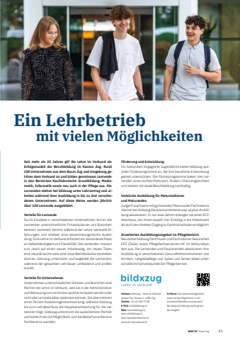 BEST OF BEST OFPortrait xxx Stadt Zug 412Ein Lehrbetrieb mit vielen M%u00f6glichkeitenAdresse: bildxzug %u2013 Lehre im VerbundLandis + Gyr-Strasse 1, 6300 ZugTelefon: +41 41 544 77 00E-Mail: info@bildxzug.chWeb: www.bildxzug.ch,www.iaf.bildxzug.ch,www.faszinationtechnik.ch,www.efz-international.chIn K%u00fcrze: Eine abwechslungsreiche Lehre mit der M%u00f6glichkeit, in verschiedene Betriebe einzu tauchen? Der Verbund bildxzug macht genau das m%u00f6glich.Seit mehr als 25 Jahren gilt die Lehre im Verbund als Erfolgsmodell der Berufsbildung im Kanton Zug. Rund 150 Unternehmen aus dem Raum Zug und Umgebung geh%u00f6ren dem Verbund an und bilden gemeinsam Lernende in den Bereichen Kaufm%u00e4nnische Grundbildung, Mediamatik, Informatik sowie neu auch in der Pflege aus. Die Lernenden stehen bei bildxzug unter Lehrvertrag und arbeiten w%u00e4hrend ihrer Ausbildung in bis zu drei verschiedenen Unternehmen. Auf diese Weise werden j%u00e4hrlich %u00fcber 120 Lernende ausgebildet.Vorteile f%u00fcr LernendeDurch Eins%u00e4tze in verschiedenen Unternehmen lernen die Lernenden unterschiedliche Firmenkulturen und Branchen kennen, sammeln bereits w%u00e4hrend der Lehre wertvolle Erfahrungen und erleben eine abwechslungsreiche Ausbildung. Eine Lehre im Verbund erfordert ein besonderes Mass an Selbstst%u00e4ndigkeit und Flexibilit%u00e4t. Die Lernenden m%u00fcssen sich rasch auf einen neuen Arbeitsweg, ein neues Team, eine neue Branche oder eine neue Betriebskultur einstellen k%u00f6nnen. bildxzug unterst%u00fctzt und begleitet die Lernenden w%u00e4hrend der gesamten Lehrdauer umfassend und professionell. Vorteile f%u00fcr UnternehmenUnternehmen unterschiedlicher Gr%u00f6ssen und Branchen sind Partner der Lehre im Verbund, weil sie in der Administration und Betreuung von Lernenden sp%u00fcrbar entlastet werden oder nicht alle Lernziele allein abdecken k%u00f6nnen. Sie %u00fcbernehmen einen Teil der Ausbildungsverantwortung, w%u00e4hrend bildxzug bis zum Lehrabschluss die Hauptverantwortung f%u00fcr die Lernenden tr%u00e4gt. bildxzug unterst%u00fctzt die ausbildenden Partner und bietet ihnen die M%u00f6glichkeit, sich bei Bedarf an erfahrene Fachleute zu wenden.F%u00f6rderung und EntwicklungF%u00fcr besonders engagierte Jugendliche bietet bildxzug spezielle F%u00f6rderprogramme an, die ihre berufliche Entwicklung gezielt unterst%u00fctzen. Die F%u00f6rderprogramme bieten den Lernenden einen echten Mehrwert, f%u00f6rdern Chancengleichheit und st%u00e4rken die duale Berufsbildung nachhaltig. Verk%u00fcrzte Ausbildung f%u00fcr Maturandinnen und MaturandenJunge Erwachsene mit gymnasialer Matura oder Fachmatura k%u00f6nnen bei bildxzug die praxisorientierte way up plus-Ausbildung absolvieren. In nur zwei Jahren erlangen sie einen EFZAbschluss, der ihnen sowohl den Einstieg in die Arbeitswelt als auch den direkten Zugang zu Fachhochschulen erm%u00f6glicht. Erweitertes Ausbildungsangebot im PflegebereichNeu bildet bildxzug Fachfrauen und Fachm%u00e4nner Gesundheit EFZ (FaGe) sowie Pflegefachpersonen HF im Verbundsystem aus. Die Lernenden und Studierenden absolvieren ihre Ausbildung in verschiedenen Gesundheitsinstitutionen wie Kliniken, Langzeitpflege und Spitex und lernen dabei unterschiedliche Schwerpunkte der Pflege kennen.