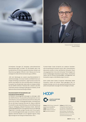 BEST OF BEST OFPortrait xxx Stadt Zug 432Adresse: CONTE & Partner Treuhand AGChamerstrasse 174, 6300 ZugTelefon: +41 41 720 02 40E-Mail: info@conte-treuhand.chWeb: www.conte-treuhand.chIn K%u00fcrze: Bei CONTE & Partner Treuhand AG erwartet Sie ein Team aus erfahrenen, hochqualifi zierten Spezialist:innen in den Bereichen Treuhand und Steuern. Mit Leidenschaft, pers%u00f6nlichem Einsatz und innovativen Arbeitstools k%u00fcmmern wir uns um Ihre unternehmerischen Bed%u00fcrfnisse. schneiderte L%u00f6sungen f%u00fcr komplexe unternehmerische Herausforderungen zu fi nden. Ihr Ziel besteht darin, der Kundschaft durch Minimierung administrativer H%u00fcrden und Maximierung digitaler Effi zienz mehr Ressourcen f%u00fcr die strategische Unternehmensentwicklung zu er%u00f6ffnen. %u00abWir sind %u00fcberzeugt von unserer zukunftsorientierten Investitionsstrategie, die darauf abzielt, die Bed%u00fcrfnisse von morgen fr%u00fchzeitig zu antizipieren%u00bb, sagt Francesco Conte. Der Kanton Zug, bekannt f%u00fcr seine Vorreiterrolle im Hinblick auf Innovation und Attraktivit%u00e4t, bietet daf%u00fcr ein ideales Umfeld. Da die CONTE & Partner Treuhand AG in diesem zukunftsorientierten Kanton ans%u00e4ssig ist, gelingt es ihr bestens, an der Spitze der Branchenentwicklung zu bleiben. Zusammenarbeit mit kompetenten und innovativen Partnernfi rmen Um fachlich herausragende Leistungen zu erbringen, z%u00e4hlt die CONTE & Partner Treuhand AG auf kompetente und innovative Partner, wie auf das Softwareunternehmen Abacus Research AG und deren Tochtergesellschaften, die DeepCloud AG und die Hoop Corporate Services SA. Abacus stellt der Treuhandfi rma das ideale Werkzeug, wie die Software l%u00f6sung Hoop zur Verf%u00fcgung, erl%u00e4utert Francesco Conte. %u00abDank der vollst%u00e4ndig digitalisierten L%u00f6sung bietet Hoop die einzigartige M%u00f6glichkeit, innerhalb weniger Stunden eine Firma zu gr%u00fcnden und Handelsregister%u00e4nderungen vorzunehmen. Dank der digitalen Identit%u00e4t DeepID und der digitalen Signatur DeepSign er%u00fcbrigt sich der Gang zum Notariat bzw. Amt.%u00bb Firmeninhaber Conte schw%u00e4rmt von weiteren Vorteilen: %u00abDie Anwendung ist %u00e4usserst sicher, denn Unternehmensdokumente werden in einer zertifi zierten Schweizer CloudL%u00f6sung gespeichert. Sie vereint Schweizer Technologien mit einem erstklassigen Schweizer Support-Team, eine Kombination, die f%u00fcr h%u00f6chste Zuverl%u00e4ssigkeit, Verf%u00fcgbarkeit und Kompetenz sorgt und die Bedienung ist intuitiv.%u00bbNicht zuletzt dank dieses innovativen Hilfsmittels bleibt Francesco Conte und seinem Team gen%u00fcgend Zeit, im direkten Kontakt und mit viel zwischenmenschlicher Kompetenz die optimalen L%u00f6sungen f%u00fcr Ihre Anliegen zu fi nden. Francesco Conte, Dipl. Treuhandexperte Gr%u00fcnder und Inhaber
