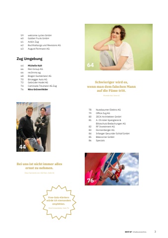 BEST OF Inhaltsverzeichnis 359 welcome cycles GmbH60 Golden Fruits GmbH61 Acklin Zug62 Buchhaltungs und Revisions AG63 August Portmann AGZug Umgebung64 Michelle Kalt66 Reci Group AG66 recImmo ag68 Biogen Switzerland AG70 Binzegger Auto AG72 Gebr%u00fcder Hodel AG74 Caminada Treuhand AG Zug76 Nino Gr%u00fcnenfelder64Schwieriger wird es, wenn man dem falschen Mann auf die F%u00fcsse tritt.Michelle Kalt, Seite 6478 Nussbaumer Elektro AG79 Office Zug AG80 2ECK Architekten GmbH81 A. Christen Spenglerei & Blitzschutz Bedachungen AG82 RF Investment AG83 D%u00fcnnenberger AG84 Infanger Gesunder Schlaf GmbH85 Bikecorner GmbH86 Specials76Free-Solo-Klettern w%u00fcrde ich niemandem empfehlen.Nino Gr%u00fcnenfelder, Seite 7644Bei uns ist nicht immer alles ernst zu nehmen. Oscar Sarmiento von %u00abVoll Ine%u00bb, Seite 44