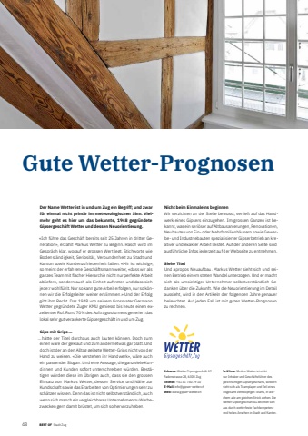 481 BEST OF BEST OF Stadt Zug Portrait xxxGute Wetter-PrognosenAdresse: Wetter Gipsergesch%u00e4ft AGFadenstrasse 28, 6300 ZugTelefon: +41 41 740 39 10E-Mail: info@gipser-wetter.chWeb: www.gipser-wetter.chIn K%u00fcrze: Markus Wetter ist nicht nur Inhaber und Gesch%u00e4ftsf%u00fchrer des gleichnamigen Gipsergesch%u00e4fts, sondern sieht sich als Teamplayer und Teil eines insgesamt zehnk%u00f6pfi gen Teams, in welchem alle am gleichen Strick ziehen. Die Wetter Gipsergesch%u00e4ft AG zeichnet sich aus durch wetterfeste Fachkompetenz und hohes Ansehen in Stadt und Kanton.Der Name Wetter ist in und um Zug ein Begriff; und zwar f%u00fcr einmal nicht prim%u00e4r im meteorologischen Sinn. Vielmehr geht es hier um das bekannte, 1948 gegr%u00fcndete Gipsergesch%u00e4ft Wetter und dessen Neuorientierung.%u00abIch f%u00fchre das Gesch%u00e4ft bereits seit 25 Jahren in dritter Generation%u00bb, erz%u00e4hlt Markus Wetter zu Beginn. Rasch wird im Gespr%u00e4ch klar, worauf er grossen Wert legt. Stichworte wie Bodenst%u00e4ndigkeit, Seriosit%u00e4t, Verbundenheit zu Stadt und Kanton sowie Kundenzufriedenheit fallen. %u00abMir ist wichtig%u00bb, so meint der erfahrene Gesch%u00e4ftsmann weiter, %u00abdass wir als ganzes Team mit flacher Hierarchie nicht nur perfekte Arbeit abliefern, sondern auch als Einheit auftreten und dass sich jede:r wohlf%u00fchlt. Nur so kann gute Arbeit erfolgen, nur so k%u00f6nnen wir die Erfolgsleiter weiter erklimmen.%u00bb Und der Erfolg gibt ihm Recht. Das 1948 von seinem Grossvater Germann Wetter gegr%u00fcndete Zuger KMU geniesst bis heute einen exzellenten Ruf. Rund 70% des Auftragsvolumens generiert das lokal sehr gut verankerte Gipsergesch%u00e4ft in und um Zug.Gips mit Grips %u2026%u2026 h%u00e4tte der Titel durchaus auch lauten k%u00f6nnen. Doch zum einen w%u00e4re der geklaut und zum andern etwas gar platt. Und doch ist der an den Alltag gelegte Wetter-Grips nicht von der Hand zu weisen. %u00abDie verstehen ihr Handwerk%u00bb, w%u00e4re auch ein passender Slogan. Und eine Aussage, die ganz viele Kundinnen und Kunden sofort unterschreiben w%u00fcrden. Best%u00e4tigen w%u00fcrden diese im %u00dcbrigen auch, dass sie den grossen Einsatz von Markus Wetter, dessen Service und N%u00e4he zur Kundschaft sowie das Erarbeiten von Optimierungen sehr zu sch%u00e4tzen wissen. Denn das ist nicht selbstverst%u00e4ndlich, auch wenn sich manch ein vergleichbares Unternehmen zu Werbezwecken gern damit br%u00fcstet, um sich so hervorzuheben.Nicht beim Einmaleins beginnenWir verzichten an der Stelle bewusst, vertieft auf das Handwerk eines Gipsers einzugehen. Im grossen Ganzen ist bekannt, was ein seri%u00f6ser auf Altbausanierungen, Renovationen, Neubauten von Ein- oder Mehrfamilienh%u00e4usern sowie Gewerbe- und Industriebauten spezialisierter Gipserbetrieb an kreativer und exakter Arbeit leistet. Auf der anderen Seite sind ausf%u00fchrliche Infos jederzeit auf der Webseite zu entnehmen.Siehe TitelUnd apropos Neuaufbau. Markus Wetter sieht sich und seinen Betrieb einem steten Wandel unterzogen. Und er macht sich als umsichtiger Unternehmer selbstverst%u00e4ndlich Gedanken %u00fcber die Zukunft. Wie die Neuorientierung im Detail aussieht, wird in den Artikeln der folgenden Jahre genauer beleuchtet. Auf jeden Fall ist mit guten Wetter-Prognosen zu rechnen.