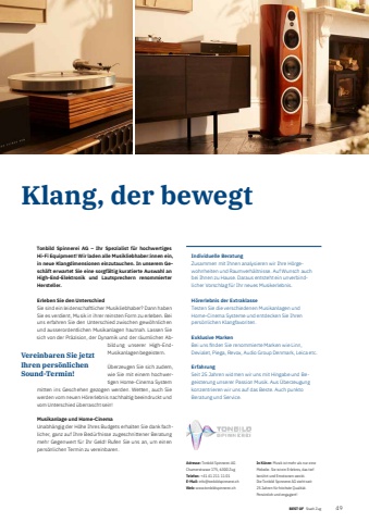 BEST OF BEST OFPortrait xxx Stadt Zug 491Klang, der bewegtAdresse: Tonbild Spinnerei AGChamerstrasse 175, 6300 ZugTelefon: +41 41 211 11 01E-Mail: info@tonbildspinnerei.chWeb: www.tonbildspinnerei.chIn K%u00fcrze: Musik ist mehr als nur eine Melodie. Sie ist ein Erlebnis, das tief ber%u00fchrt und Emotionen weckt. Die Tonbild Spinnerei AG steht seit 25%u00a0Jahren f%u00fcr h%u00f6chste Qualit%u00e4t. Pers%u00f6nlich und engagiert!Tonbild Spinnerei AG %u2013 Ihr Spezialist f%u00fcr hochwertiges Hi-Fi Equipment! Wir laden alle Musikliebhaber:innen ein, in neue Klangdimensionen einzutauchen. In unserem Gesch%u00e4ft erwartet Sie eine sorgf%u00e4ltig kuratierte Auswahl an High-End-Elektronik und Lautsprechern renommierter Hersteller.Erleben Sie den UnterschiedSie sind ein leidenschaftlicher Musikliebhaber? Dann haben Sie es verdient, Musik in ihrer reinsten Form zu erleben. Bei uns erfahren Sie den Unterschied zwischen gew%u00f6hnlichen und ausserordentlichen Musikanlagen hautnah. Lassen Sie sich von der Pr%u00e4zision, der Dynamik und der r%u00e4umlichen Abbildung unserer High-EndMusikanlagen begeistern. %u00dcberzeugen Sie sich zudem, wie Sie mit einem hochwertigen Home-Cinema System mitten ins Geschehen gezogen werden. Wetten, auch Sie werden vom neuen H%u00f6rerlebnis nachhaltig beeindruckt und vom Unterschied %u00fcberrascht sein!Musikanlage und Home-CinemaUnabh%u00e4ngig der H%u00f6he Ihres Budgets erhalten Sie dank fachlicher, ganz auf Ihre Bed%u00fcrfnisse zugeschnittener Beratung mehr Gegenwert f%u00fcr Ihr Geld! Rufen Sie uns an, um einen pers%u00f6nlichen Termin zu vereinbaren.Vereinbaren Sie jetzt Ihren pers%u00f6nlichen Sound-Termin!Individuelle BeratungZusammen mit Ihnen analysieren wir Ihre H%u00f6rgewohnheiten und Raumverh%u00e4ltnisse. Auf Wunsch auch bei Ihnen zu Hause. Daraus entsteht ein unverbindlicher Vorschlag f%u00fcr Ihr neues Musikerlebnis.H%u00f6rerlebnis der ExtraklasseTesten Sie die verschiedenen Musikanlagen und Home-Cinema Systeme und entdecken Sie Ihren pers%u00f6nlichen Klangfavoriten.Exklusive MarkenBei uns fi nden Sie renommierte Marken wie Linn, Devialet, Piega, Revox, Audio Group Denmark, Leica etc.ErfahrungSeit 25 Jahren widmen wir uns mit Hingabe und Begeisterung unserer Passion Musik. Aus %u00dcberzeugung konzentrieren wir uns auf das Beste. Auch punkto Beratung und Service.