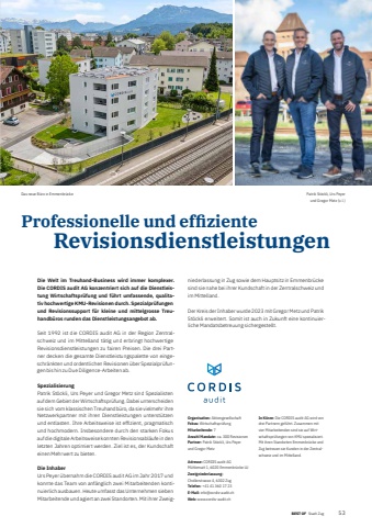 BEST OF BEST OFPortrait xxx Stadt Zug 531Professionelle und effi ziente RevisionsdienstleistungenOrganisation: AktiengesellschaftFokus: Wirtschaftspr%u00fcfungMitarbeitende: 7Anzahl Mandate: ca. 300 RevisionenPartner: Patrik St%u00f6ckli, Urs Peyer und Gregor MetzAdresse: CORDIS audit AGM%u00fchlematt 1, 6020 Emmenbr%u00fccke LUZweigniederlassung: Chollerstrasse 4, 6302 ZugTelefon: +41 41 360 17 23E-Mail: info@cordis-audit.chWeb: www.cordis-audit.chIn K%u00fcrze: Die CORDIS audit AG wird von drei Partnern gef%u00fchrt. Zusammen mit vier Mitarbeitenden sind sie auf Wirtschaftspr%u00fcfungen von KMU spezialisiert. Mit ihren Standorten Emmen br%u00fccke und Zug betreuen sie Kunden in der Zentralschweiz und im Mittelland.Die Welt im Treuhand-Business wird immer komplexer. Die CORDIS audit AG konzentriert sich auf die Dienstleistung Wirtschaftspr%u00fcfung und f%u00fchrt umfassende, qualitativ hochwertige KMU-Revisionen durch. Spezialpr%u00fcfungen und Revisionssupport f%u00fcr kleine und mittelgrosse Treuhandb%u00fcros runden das Dienstleistungsangebot ab. Seit 1992 ist die CORDIS audit AG in der Region Zentralschweiz und im Mittelland t%u00e4tig und erbringt hochwertige Revisionsdienstleistungen zu fairen Preisen. Die drei Partner decken die gesamte Dienstleistungspalette von eingeschr%u00e4nkten und ordentlichen Revisionen %u00fcber Spezialpr%u00fcfungen bis hin zu Due Diligence-Arbeiten ab. SpezialisierungPatrik St%u00f6ckli, Urs Peyer und Gregor Metz sind Spezialisten auf dem Gebiet der Wirtschaftspr%u00fcfung. Dabei unterscheiden sie sich vom klassischen Treuhandb%u00fcro, da sie vielmehr ihre Netzwerkpartner mit ihren Dienstleistungen unterst%u00fctzen und entlasten. Ihre Arbeitsweise ist effi zient, pragmatisch und hochmodern. Insbesondere durch den starken Fokus auf die digitale Arbeitsweise konnten Revisionsabl%u00e4ufe in den letzten Jahren optimiert werden. Ziel ist es, der Kundschaft einen Mehrwert zu bieten. Die InhaberUrs Peyer %u00fcbernahm die CORDIS audit AG im Jahr 2017 und konnte das Team von anf%u00e4nglich zwei Mitarbeitenden kontinuierlich ausbauen. Heute umfasst das Unternehmen sieben Mitarbeitende und agiert an zwei Standorten. Mit ihrer Zweigniederlassung in Zug sowie dem Hauptsitz in Emmenbr%u00fccke sind sie nahe bei ihrer Kundschaft in der Zentralschweiz und im Mittelland. Der Kreis der Inhaber wurde 2023 mit Gregor Metz und Patrik St%u00f6ckli erweitert. Somit ist auch in Zukunft eine kontinuierliche Mandatsbetreuung sichergestellt. Das neue B%u00fcro in Emmenbr%u00fccke Patrik St%u00f6ckli, Urs Peyer und Gregor Metz (v. l.)