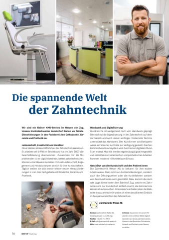 561 BEST OF BEST OF Stadt Zug Portrait xxxDie spannende Welt der Zahntechnik Adresse: Zahntechnik Weber AGGrafenaustrasse 11, 6300 ZugTelefon: +41 41 711 79 73E-Mail: info@zahntechnik-weber.chWeb: www.zahntechnik-weber.chIn K%u00fcrze: Zusammen mit seinen Mitarbeiter:innen ist Oliver Weber t%u00e4glich bestrebt, sein bestes zahntechnisches K%u00f6nnen in den Bereichen Orthodontie, Keramik und Prothetik unter Beweis zu stellen. Wir sind ein kleiner KMU-Betrieb im Herzen von Zug. Unserer Zentralschweizer Kundschaft bieten wir feinste Dienstleistungen in den Fachbereichen Orthodontie, Keramik und Prothetik an. Leidenschaft, Kreativit%u00e4t und HerzblutOliver Weber ist Gesch%u00e4ftsf%u00fchrer der Zahntechnik Weber%u00a0AG. Er arbeitet seit 1998 im Betrieb und hat im Jahr 2007 die Gesch%u00e4ftsleitung %u00fcbernommen. Zusammen mit 20%u00a0 Mitarbeitenden ist er t%u00e4glich bestrebt, bestes zahntechnisches K%u00f6nnen unter Beweis zu stellen. Mit viel Leidenschaft, Engagement und Herzblut setzen sie sich f%u00fcr ihre Kundschaft ein. T%u00e4glich stellen sie sich immer wieder neuen Herausforderungen in den drei Fachgebieten Orthodontie, Keramik und Prothetik. Handwerk und DigitalisierungDie Branche ist weitgehend noch vom Handwerk gepr%u00e4gt. Dennoch ist die Digitalisierung in der Zahntechnik auf dem Vormarsch und wird immer wichtiger. Modernste Technik unter st%u00fctzt das Handwerk. Den Kund:innen wird beispielsweise ein Scanner zur Miete zur Verf%u00fcgung gestellt. Das herk%u00f6mmliche Abdrucksystem wird durch einen digitalen MundScan ersetzt. Modelle werden regelm%u00e4ssig digital hergestellt und selbst bei den keramischen und prothetischen Arbeiten kommen moderne Hilfsmittel zum Einsatz. Gesch%u00e4tzt von der Kundschaft und den Patient:innenDie Zahntechnik Weber%u00a0 AG ist bekannt f%u00fcr ihre exakte Arbeits weise. Aber nicht nur die Dienstleistungen, sondern auch die %u00d6ffnungszeiten oder die Kurierfahrten werden von den Kund:innen sehr gesch%u00e4tzt. Dazu kommt die zentrale Lage direkt hinter dem Bahnhof Zug, welche es Zahn%u00e4rzten und der Kundschaft einfach macht, die Zahntechnik Weber%u00a0AG aufzusuchen. Interessierte erhalten %u00fcber die Webseite www.zahntechnik-weber.ch einen detaillierten Einblick in die spannende Welt der Zahntechnik.