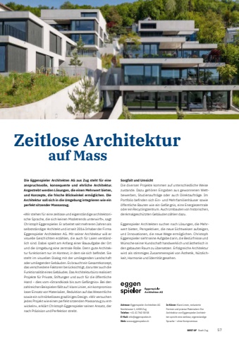 BEST OF BEST OFPortrait xxx Stadt Zug 571Zeitlose Architektur auf MassAdresse: Eggenspieler Architekten AGNordstrasse 1, 6300 ZugTelefon: +41 41 760 58 58E-Mail: info@eggenspieler.chWeb: www.eggenspieler.chIn K%u00fcrze: Klare Linien, reduzierte Formen und pr%u00e4zise Materialien: Die Architektur von Eggenspieler Architekten spricht eine zeitlose, eigenst%u00e4ndige Sprache %u2013 ohne Kompromisse.Die Eggenspieler Architekten AG aus Zug steht f%u00fcr eine anspruchsvolle, konsequente und ehrliche Architektur. Angestrebt werden L%u00f6sungen, die einen Mehrwert bieten, und Konzepte, die frische Blickwinkel erm%u00f6glichen. Die Architektur soll sich in die Umgebung integrieren wie ein perfekt sitzender Massanzug.%u00abWir stehen f%u00fcr eine zeitlose und eigenst%u00e4ndige architektonische Sprache, die sich keinen Modetrends unterwirft%u00bb, sagt Christoph Eggenspieler. Er arbeitet seit mehreren Jahren als selbstst%u00e4ndiger Architekt und ist seit 2016 Inhaber der Firma Eggenspieler Architekten AG. Mit seiner Architektur will er visuelle Geschichten erz%u00e4hlen, die auch f%u00fcr Laien verst%u00e4ndlich sind. Dabei spielt am Anfang einer Bauaufgabe der Ort und die Umgebung eine zentrale Rolle. Denn gute Architektur funktioniert nur im Kontext, in dem sie sich befi ndet. Sie steht im visuellen Dialog mit der umliegenden Landschaft oder umliegenden Geb%u00e4uden. Es braucht ein Gesamtkonzept, das verschiedene Faktoren ber%u00fccksichtigt, darunter auch die Funktionalit%u00e4t eines Geb%u00e4udes. Das Architekturb%u00fcro realisiert Projekte f%u00fcr Private, Stiftungen und auch f%u00fcr die %u00f6ffentliche Hand %u2013 dies vom %u00abStrandkiosk bis zum Gef%u00e4ngnis%u00bb. Bei den zahlreichen Beispielen f%u00e4llt auf: klare Linien, ein kompromissloser Einsatz von Materialien, Reduktion auf das Wesentliche sowie ein schn%u00f6rkelloses gradliniges Design. %u00abWir versuchen jedes Projekt wie einen perfekt sitzenden Massanzug zu entwickeln%u00bb, erkl%u00e4rt Christoph Eggenspieler seinen Ansatz, der nach Pr%u00e4zision und Perfektion strebt.Sorgfalt und UmsichtDie diversen Projekte kommen auf unterschiedliche Weise zustande. Dazu geh%u00f6ren Eingaben aus gewonnenen Wettbewerben, Studienauftr%u00e4ge oder auch Direktauftr%u00e4ge. Im Portfolio befi nden sich Ein- und Mehrfamilienh%u00e4user sowie %u00f6ffentliche Bauten wie ein Gef%u00e4ngnis, eine Energiezentrale oder ein Recyclingzentrum. Auch Umbauten von historischen, denkmalgesch%u00fctzten Geb%u00e4uden z%u00e4hlen dazu.Eggenspieler Architekten suchen nach L%u00f6sungen, die Mehrwert bieten, Perspektiven, die neue Sichtweisen aufzeigen, und Innovationen, die neue Wege erm%u00f6glichen. Christoph Eggenspieler sieht seine Aufgabe darin, die Bed%u00fcrfnisse und W%u00fcnsche seiner Kundschaft handwerklich und %u00e4sthetisch in den gebauten Raum zu %u00fcbersetzen. Erfolgreiche Architektur wird als stimmiges Zusammenspiel von %u00c4sthetik, N%u00fctzlichkeit, Harmonie und Identit%u00e4t gesehen.