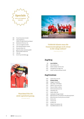 4 BEST OF Inhaltsverzeichnis9888 Murer Busreisen GmbH89 Silvia Neidhart | Atelier f%u00fcr ganzheitliches Bauen90 B%u00fctikofer & Partner AG91 Luft und Hygiene GmbH92 MH Hochbauatelier GmbH93 Brauerei Baar AG94 gloor & meier treuhand gmbh94 Rysma Real Estate AG95 Sika AG96 Emil Frey AG SihlbruggZug Berg98 Lenz H%u00e4chler100 Hitz Holzbau AG101 Elektro Weber Partner AG102 Garage Bircher %u00c4geri AG103 Hotel und Seminarhaus L%u00e4ndliZug Ennetsee104 CyOne Security AG106 Stubete G%u00e4ng108 Hegglin Group AG110 hair relax | Jutta Bach112 SWISS Trennwand AG114 Macos Coffee Crafters115 Shell (Switzerland) AG116 Vets4Pets AG117 Atelier S&G AG118 Holzboden Design GmbH119 B%u00f6hmPartners Immobilien Verwaltung GmbH119 B%u00f6hmPartners Facility Service GmbH120 Semax AG122 Treowa AG123 Go Bau AG124 Zeberli Immobilien AG125 SwissBioColostrum AGVielleicht k%u00f6nnte man die Sonnenunterg%u00e4nge noch etwas in die L%u00e4nge ziehen?Stubete G%u00e4ng, Seite 106SpecialsInfos und AngeboteSeite 86106Manchmal bin ich nicht egoistisch genug.Lenz H%u00e4chler, Seite 98