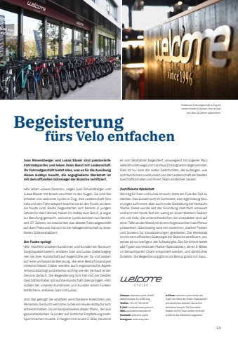 BEST OF Portrait xxx 591Begeisterung f%u00fcrs Velo entfachenAdresse: welcome cycles GmbHAabachstrasse 10, 6300 ZugTelefon: +41 41 720 43 43E-Mail: info@welcomecycles.chWeb: www.welcomecycles.chFacebook: welcome cyclesInstagram: welcomecyclesIn K%u00fcrze: welcome cycles bietet alle Typen von Velos der Marke %u00abSpecialized%u00bb und s%u00e4mtliches Zubeh%u00f6r, das es f%u00fcrs Velofahren braucht. Die Gesch%u00e4ftsinhaber und ihr Team wollen die Kundschaft f%u00fcr das Velofahren begeistern.Ivan Rimensberger und Lukas Blaser sind passionierte Fahrradsportler und leben ihren Beruf mit Leidenschaft. Ihr Fahrradgesch%u00e4ft bietet alles, was es f%u00fcr die Aus%u00fcbung dieses Hobbys baucht, die angegliederte Werkstatt ist mit dem offi ziellen G%u00fctesiegel der Branche zertifi ziert. %u00abWir leben unsere Passion%u00bb, sagen Ivan Rimensberger und Lukas Blaser mit einem Leuchten in den Augen. Sie sind die Inhaber von welcome cycles in Zug, ihre Leidenschaft f%u00fcrs Velo und den Fahrradsport brachte sie an den Punkt, an dem sie heute sind. Beide begeisterten sich bereits in jungen Jahren f%u00fcr das Fahrrad, haben ihr Hobby zum Beruf, ja sogar zur Berufung gemacht. welcome cycles existiert nun bereits seit 27 Jahren, ist inzwischen das %u00e4lteste Fahrradgesch%u00e4ft auf dem Platz und hat sich in der Velogemeinschaft zu einer festen Gr%u00f6sse etabliert.Der Funke springt%u00abWir m%u00f6chten unseren Kundinnen und Kunden ein RundumSorglospaket bieten%u00bb, erkl%u00e4ren Ivan und Lukas. Dabei begegnen sie ihrer Kundschaft auf Augenh%u00f6he per Du und setzen auf eine umfassende Beratung, die eine Bed%u00fcrfnisanalyse miteinschliesst. Dabei werden auch ergonomische Aspekte ber%u00fccksichtigt und ebenso wichtig wie der Verkauf ist der Service danach. Die Begeisterung f%u00fcrs Fahrrad der beiden Gesch%u00e4ftsinhaber soll auf die Kundschaft %u00fcberspringen. %u00abWir wollen bei unseren Kundinnen und Kunden einen Funken entfachen%u00bb, erkl%u00e4ren Ivan und Lukas.Und das gelingt! Sie erz%u00e4hlen verschiedene Anekdoten von Personen, die durch welcome cycles ein neues Hobby f%u00fcr sich entdeckt haben. Da ist beispielsweise dieser Mann, der aus gesundheitlichen Gr%u00fcnden auf %u00e4rztliche Empfehlung mehr Sport machen musste. Er begann mit einem E-Bike, heute ist er vom Velofahren begeistert, vorwiegend mit eigener Muskelkraft unterwegs und hat etwa 30 Kilogramm abgenommen. Dies ist nur eine der vielen Geschichten, die aufzeigen, wie sich Kundinnen und Kunden von der Leidenschaft der beiden Gesch%u00e4ftsinhaber und ihrem Team anstecken lassen.Zertifi zierte WerkstattWichtig f%u00fcr Ivan und Lukas ist auch, stets am Puls der Zeit zu bleiben. Das %u00e4ussert sich im Sortiment, das regelm%u00e4ssig Neuerungen aufnimmt, aber auch in der Gestaltung der Verkaufsfl%u00e4che. Diese wurde seit der Gr%u00fcndung mehrfach erneuert und erinnert heute fast ein wenig an einen Western-Saloon mit viel Holz, die unterschiedlichen Servicepakete sind auf einer Tafel an der Wand mit einem Augenzwinkern als Menus pr%u00e4sentiert. Gleichzeitig wird mit modernen, starken Farben und Screens f%u00fcr Visualisierungen gearbeitet. Die Werkstatt ist mit dem offi ziellen G%u00fctesiegel der Branche zertifi ziert, von denen es nur wenige in der Schweiz gibt. Das Sortiment bietet alle Typen von Velos der Marke %u00abSpecialized%u00bb, deren E-Bikes im benachbarten Cham entwickelt werden, und s%u00e4mtliches Zubeh%u00f6r. Die Begeisterung gibt es als Bonus gratis mit dazu.Etabliertes Fahrradgesch%u00e4ft in Zug mit einem breiten Sortiment. Hier ist man seit %u00fcber 20 Jahren willkommen.
