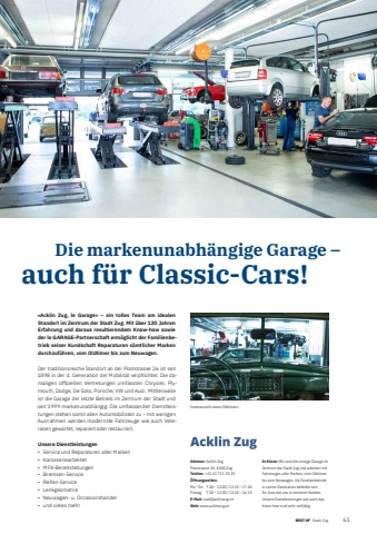 BEST OF BEST OFPortrait xxx Stadt Zug 61 Die markenunabh%u00e4ngige Garage %u2013auch f%u00fcr Classic-Cars!Adresse: Acklin ZugPoststrasse 26, 6300 ZugTelefon: +41 41 711 35 35%u00d6ffnungszeiten:Mo %u2013 Do 7.30 %u2013 12.00 / 13.10 %u2013 17.45Freitag 7.30 %u2013 12.00 / 13.10 %u2013 16.15E-Mail: mail@acklinzug.chWeb: www.acklinzug.chIn K%u00fcrze: Wir sind die einzige Garage im Zentrum der Stadt Zug und arbeiten mit Fahrzeugen aller Marken, vom Oldtimer bis zum Neuwagen. Als Familienbetrieb in vierter Generation befi ndet sich Ihr Auto bei uns in sicheren H%u00e4nden. Unsere Dienstleistungen wie auch das Know-how sind sehr vielf%u00e4ltig.%u00abAcklin Zug, le Garage%u00bb %u2013 ein tolles Team am idealen Standort im Zentrum der Stadt Zug. Mit %u00fcber 120 Jahren Erfahrung und daraus resultierendem Know-how sowie der le GARAGE-Partnerschaft erm%u00f6glicht der Familienbetrieb seiner Kundschaft Reparaturen s%u00e4mtlicher Marken durchzuf%u00fchren, vom Oldtimer bis zum Neuwagen.Der traditionsreiche Standort an der Poststrasse%u00a026 ist seit 1898 in der 4.%u00a0Generation der Mobilit%u00e4t verpflichtet. Die damaligen offi ziellen Vertretungen umfassten Chrysler, Plymouth, Dodge, De Soto, Porsche, VW und Audi. Mittlerweile ist die Garage der letzte Betrieb im Zentrum der Stadt und seit 1999 markenunabh%u00e4ngig. Die umfassenden Dienstleistungen stehen somit allen Automobilisten zu %u2013 mit wenigen Ausnahmen werden modernste Fahrzeuge wie auch Veteranen gewartet, repariert oder restauriert.Unsere Dienstleistungen%u2022 Service und Reparaturen aller Marken%u2022 Karosseriearbeiten%u2022 MFK-Bereitstellungen%u2022 Bremsen-Service%u2022 Reifen-Service%u2022 Lenkgeometrie%u2022 Neuwagen- u. Occasionshandel%u2022 und vieles mehrInnenansicht eines Oldtimers