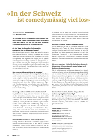 641 BEST OF BEST OF PromiText und Intervie Janine TschoppFoto: Ruxandra BaleaIm Interview spricht Michelle Kalt unter anderem %u00fcber den Stand der Frauen in der Comedy- und in der Anwaltsszene. Auch erkl%u00e4rt sie, was aus ihrer Sicht Schweizer Comedy auszeichnet und ob sie selber lustig ist.Sie sind Stand-Up Comedian, Rechtsanw%u00e4ltin und Autorin. Was am liebsten und warum?Alles davon ist auf seine Art l%u00e4ssig, aber alles bringt auch anstrengende Momente mit sich. Ich glaube, am meisten Spass habe ich, wenn ich einen Text schreibe und so richtig darin aufgehe, weil Gedanken frei fliessen und mir st%u00e4ndig neue Ideen kommen. Dann vergesse ich alles um mich herum und kann auch mal drei Stunden am St%u00fcck schreiben, ohne zu merken, wie die Zeit vergeht. Das passiert zwar eher, wenn ich den Comedy-Hut aufhabe, kommt aber auch bei der %u00abnormalen%u00bb Arbeit vor.Was muss man k%u00f6nnen als Stand-Up Comedian?Man braucht ein %u00abGschp%u00fcri%u00bb f%u00fcr neuralgische Punkte. Denn damit Comedy interessant ist, muss sie das Publikum ein wenig %u00abst%u00fcpfen%u00bb. Dabei ist Authentizit%u00e4t wichtig: Man sollte sich seiner eigenen Haltungen bewusst sein und auch in etwa wissen, wie einen das Publikum wahrnimmt. Eigenund Fremdperspektive unterscheiden sich ja bisweilen. Neugierig sein hilft immer, und (aufrichtige) Selbstironie ist auch ziemlich wichtig. Worin liegt aus Ihrer Sicht der Unterschied zur Satire?Es gibt bestimmt kluge, belesene Menschen da draussen, die den Unterschied zwischen Stand-up und Satire pr%u00e4zis und in wenigen S%u00e4tzen erkl%u00e4ren k%u00f6nnen. Ich geh%u00f6re leider nicht dazu und werde deshalb improvisieren: Der Begriff %u00abStand-up%u00bb Comedy bezieht sich in meinen Augen vor allem auf das Format (ein Mensch erz%u00e4hlt lustige Dinge und bedient sich %u2013 abgesehen vom Mikrofon und vielleicht noch einem Barhocker %u2013 in der Regel keiner besonderen Requisiten). Satire beschreibt den Inhalt (auf humoristische Art ge%u00e4usserte Standpunkte zu politischen und gesellschaftlichen Themen). Die beiden Dinge k%u00f6nnen sich also durchaus %u00fcberschneiden. Wie einfach haben es Frauen in der Comedy-Szene?Solange einem die Menschen in Entscheidungspositionen wohlgesinnt sind und man nicht zu sehr aneckt, ist eigentlich alles gut. Da hilft es manchmal durchaus, dass man als Frau in der Minderheit ist, weil man eher aus der Masse hervorsticht. Schwieriger wird es, wenn man in seiner Comedy irgendeine imagin%u00e4re Grenze %u00fcberschreitet oder, Gott bewahre, dem falschen Mann auf die F%u00fcsse tritt. Meiner Wahrnehmung nach werden Frauen in solchen F%u00e4llen deutlich h%u00e4rter beund verurteilt als M%u00e4nner. Wie einfach haben es Frauen in der Anwaltsszene?Sicher wesentlich leichter als in anderen Branchen, zumal inzwischen mehr Frauen als M%u00e4nner Jus studieren und die meisten Menschen auch nicht (mehr) denken, wir seien f%u00fcr den Beruf von Natur aus weniger geeignet. Dennoch sind Frauen auf Partnerstufe %u2013 der Chefetage einer Anwaltskanzlei %u2013 immer noch in der Unterzahl, vor allem in grossen Kanzleien. %u00dcber die Gr%u00fcnde wissen andere besser Bescheid als ich. Sie waren heuer Jury-Mitglied der Swiss Comedy Awards. Was zeichnet Schweizer Comedy aus und wie gut ist sie im internationalen Vergleich?F%u00fcr ein so kleines Land, welches noch dazu mehrere Sprachregionen aufweist, ist in der Schweiz comedym%u00e4ssig wirklich viel los und das Potenzial ist sicher noch nicht ausgesch%u00f6pft. Was uns auszeichnet, ist glaube ich vor allem die enorme Diversit%u00e4t. Es gibt in der Schweiz zwar nicht dutzende international erfolgreiche Stand-up Comedians, aber wir haben in allen Sparten der Comedy K%u00fcnstler:innen, die Grossartiges leisten. Sei es als Kabarettist, Drehbuchautorin, Standup Comedian, Politsatirikerin oder mit Sketches auf Social Media. Sie leben heute in Z%u00fcrich. Welchen Bezug haben Sie zu Ihrer urspr%u00fcnglichen Heimat Zug?Ich habe ein enges Verh%u00e4ltnis zu meiner Familie und weil ausser mir alle noch in Zug wohnen, bin ich gef%u00fchlt st%u00e4ndig hier. Ich mag es, in Zug zu sein, weil ich nie das Gef%u00fchl habe, etwas zu verpassen, wenn ich nur zu Hause rumsitze. Das geniesse ich sehr.Lieblings-Comedian: Rhys NicholsonLieblings-Buch: %u00abDie Vermessung der Welt%u00bb von Daniel KehlmannLieblings-Film: %u00abC%u2019est la vie %u2013 So sind wir, so ist das Leben%u00bb von R%u00e9mi Bezan%u00e7onWas bringt Sie zum Lachen: Mein dreij%u00e4hriger G%u00f6ttibub. Der l%u00e4sst Sachen raus, die kann man sich nicht ausdenken.In K%u00fcrze: Michelle Kalt ist in Zug aufgewachsen und lebt heute in Z%u00fcrich. Noch immer hat sie eine enge Verbindung zu ihrem Heimatort. Sie ist Stand-Up Comedian, Anw%u00e4ltin und Autorin und hat Freude an all ihren T%u00e4tigkeiten, auch wenn es manchmal anstrengend sein kann.%u00abIn der Schweiz ist comedym%u00e4ssig viel los%u00bb