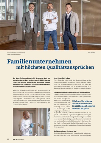 661 BEST OF BEST OF Zug Umgebung Portrait xxxFamilienunternehmen mit h%u00f6chsten Qualit%u00e4tsanspr%u00fcchenDer Name Reci schreibt weiterhin Geschichte. Nicht nur im Heimatkanton Zug, sondern auch in Z%u00fcrich, Aargau, Luzern und Schwyz. Im Fokus sind Bewertung, Verkauf, Vermietung und Verwaltung von Immobilien sowie Renovationen oder Um- und Neubauten.Begonnen hat alles 2019 mit Asrit Reci, einem Mann mit Tatendrang und %u00fcber 20 Jahren Handwerkserfahrung, und seinem Sohn Leonard. Schon 2021 wurde aufgrund des schnellen Wachstums und wachsenden Auftragsvolumens aus einer urspr%u00fcnglichen Einzelfi rma die Reci GmbH geformt. Heute z%u00e4hlt nebst einem Team aus erfahrenen Mitarbeitenden auch Asrit Recis zweiter Sohn, Labinot, zur Gesch%u00e4ftsleitung des Familienunternehmens. Neue Hauptfi liale in BaarPer 1. Dezember 2024 ist die Reci Group nach Baar, an die Oberneuhofstrasse 3, umgezogen. Dies ist die neue Hauptfi liale, die Adresse Grienbachstrasse 11 in Zug bleibt als Filiale weiterhin bestehen, und an der Neuhofstrasse 3d in Baar unterh%u00e4lt man nach wie vor ein 300 m2 grosses Magazin.Ihre Handwerker f%u00fcrs Gewerbe und den privaten BereichDie Reci GmbH bietet allerh%u00f6chste Qualit%u00e4t in den Bereichen Renovation sowie Neu- und Umbauten. Zu den Spezialit%u00e4ten des Hauses Reci geh%u00f6ren Maler- und Gipserarbeiten sowie Bodenbel%u00e4ge aller Art. %u00abWir bieten eine gute Beratung sowie pr%u00e4zise und zuverl%u00e4ssige Ausf%u00fchrung im gewerblichen wie im privaten Bereich%u00bb, unterstreicht Leonard Reci im Gespr%u00e4ch. Ein besonderes Augenmerk liegt bei der vielseitigen Materialauswahl f%u00fcr Bodenbel%u00e4ge. In Ihrem Eigenheim fehlt es an sch%u00f6nen Bodenbel%u00e4gen, oder Sie m%u00f6chten eine Wand neu vergipsen, Schimmelbefall bek%u00e4mpfen? %u00dcberlassen Sie den Profi s der Reci GmbH die fachliche Ausf%u00fchrung. Fachkompetente Ratschl%u00e4ge sowie eine professionelle Arbeit wird Ihnen garantiert. Drei Unternehmen, ein Name: ReciEhrlichkeit, Zuverl%u00e4ssigkeit und Professionalit%u00e4t pr%u00e4gen den Kern der Marke Reci. Unter dem Dach der Reci Group AG als Die Gesch%u00e4ftsleitung im Familienbetrieb: Labinot, Asrit und Leonard (v. l.)Fotos: PIRIPIXXM%u00f6chten Sie mit uns zusammenarbeiten? Es gibt keinen besseren Moment als jetzt!
