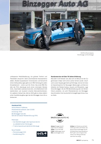 BEST OF BEST OF Zug Umgebung Portrait xxx 712umfassende Mobilit%u00e4tsl%u00f6sung, die gr%u00f6sste Freiheit und Flexibilit%u00e4t verspricht. Dank verschiedenen Karosseriemodellen, flexibel anpassbaren Innenr%u00e4umen und fortschrittlichen Softwarel%u00f6sungen gibt es ein PBV Fahrzeug f%u00fcr jeden Einsatzbereich %u2013 sicher auch f%u00fcr Ihren. Das erste PBV-Modell, der PV5, %u00fcberzeugt durch einen minimalen Wendekreis, maximales Laderaumvolumen, eine Batterieschnellladefunktion und %u00e4usserst smarten Benutzerfunktionen. Im sp%u00e4teren Verlauf des Jahres 2025 gibt es diese elektrischen Nutzfahrzeugl%u00f6sungen bei der Binzegger Auto AG zu bestaunen. KIA EV9 mit Maurizio Agresta, Remo Binzegger und Silvio BinzeggerAdresse: Binzegger Auto AGZugerstrasse 47, 6340 BaarTelefon: +41 41 769 70 80E-Mail: info@binzegger-auto.chWeb: www.binzegger-auto.chIn K%u00fcrze: Vor 30 Jahren war die Markteinf%u00fchrung von KIA in der Schweiz. Und genauso lang ist die Binzegger Auto AG auf Direktvertreter-Niveau ebenfalls am Ball. Es gibt in und um Zug kein Unternehmen, das in Bezug auf KIA %u00fcber mehr Know-how verf%u00fcgt.Steckbrief KIAHerkunftsland: S%u00fcdkoreaMitarbeitende weltweit: %u00fcber 52 000Gr%u00fcndung: 1944Bei Binzegger Auto AG: Seit der Schweizer Markteinf%u00fchrung 1994Merkmale: %u2022 Von Kleinfahrzeugen %u00fcber Sportcars bis hin zu vollelektrischen Fahrzeugen%u2022 7-Jahre Garantie auf s%u00e4mtliche FahrzeugeNeue Modelle: %u2022 Personenwagen EV3%u2022 Nutzfahrzeug PV5Rundumservice mit %u00fcber 70 Jahren ErfahrungWas aber nicht heissen will, dass sich ein Besuch an der Zugerstrasse in Baar nicht schon vorher lohnen w%u00fcrde. %u00abAuch wenn unser Hauptaugenmerk auf KIA liegt, sind wir der ideale Ansprechpartner f%u00fcr Neuwagen-Beratungen und ServiceArbeiten der Marken Subaru, Suzuki und Mitsubishi%u00bb, sagt Silvio Binzegger. Ob die MfK-Bereitstellung oder der WinterCheck anstehen, die acht Mitarbeitenden der Binzegger Auto%u00a0AG stehen ihrer Kundschaft mit langj%u00e4hrigem Know-how zur Seite.