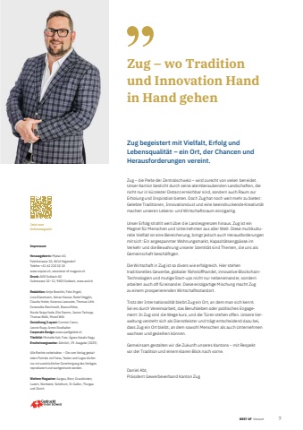 BEST OF Vorwort 72ImpressumHerausgeberin: Miplan AGFabrikstrasse 10, 4614 H%u00e4gendorfTelefon +41 62 210 10 10www.miplan.ch, www.best-of-magazin.chDruck: AVD Goldach AGSulzstrasse 10 %u201312, 9403 Goldach, www.avd.chRedaktion: Antje Brechlin, Felix Engeli, Livia Glanzmann, Adrian Hauser, Rahel Hegglin, Claudia Hutter, Katarina Lancaster, Thomas L%u00fcthiEsmeralda Reichmuth, Bianca Ritter, Nicole Seipp-Isele, Elio Stamm, Janine Tschopp, Thomas W%u00e4lti, Muriel WilliGestaltung / Layout: Carmen Cianci, Leonie Rupp, Armin StudhalterCorporate Design: www.quellgebiet.chTitelbild: Michelle Kalt, Foto: %u00c1gnes Katalin NagyErscheinungsweise: J%u00e4hrlich, 19. Ausgabe (2025)Alle Rechte vorbehalten. %u2013 Die vom Verlag gestalteten Portr%u00e4ts mit Fotos, Texten und Logos d%u00fcrfen nur mit ausdr%u00fccklicher Genehmigung des Verlages reproduziert und nachgedruckt werden.Weitere Magazine: Aargau, Bern, Graub%u00fcnden, Luzern, Nordwest, Solothurn, St. Gallen, Thurgau und Z%u00fcrichBEST OF VorwortJetzt zum Onlinemagazin!Zug begeistert mit Vielfalt, Erfolg und Lebensqualit%u00e4t %u2013 ein Ort, der Chancen und Herausforderungen vereint.Zug %u2013 die Perle der Zentralschweiz %u2013 wird zurecht von vielen beneidet. Unser Kanton besticht durch seine atemberaubenden Landschaften, die nicht nur in k%u00fcrzester Distanz erreichbar sind, sondern auch Raum zur Erholung und Inspiration bieten. Doch Zug hat noch weit mehr zu bieten: Gelebte Traditionen, Innovationslust und eine beeindruckende Kreativit%u00e4t machen unseren Lebens- und Wirtschaftsraum einzigartig.Unser Erfolg strahlt weit %u00fcber die Landesgrenzen hinaus. Zug ist ein Magnet f%u00fcr Menschen und Unternehmen aus aller Welt. Diese multikulturelle Vielfalt ist eine Bereicherung, bringt jedoch auch Herausforderungen mit sich: Ein angespannter Wohnungsmarkt, Kapazit%u00e4tsengp%u00e4sse im Verkehr und die Bewahrung unserer Identit%u00e4t sind Themen, die uns als Gemeinschaft besch%u00e4ftigen.Die Wirtschaft in Zug ist so divers wie erfolgreich. Hier stehen traditionelles Gewerbe, globaler Rohstoffhandel, innovative BlockchainTechnologien und mutige Start-ups nicht nur nebeneinander, sondern arbeiten auch oft f%u00fcreinander. Diese einzigartige Mischung macht Zug zu einem prosperierenden Wirtschaftsstandort.Trotz der Internationalit%u00e4t bleibt Zug ein Ort, an dem man sich kennt. Sei es durch Vereinsarbeit, das Berufsleben oder politisches Engagement: In Zug sind die Wege kurz, und die T%u00fcren stehen offen. Unsere Verwaltung versteht sich als Dienstleister und tr%u00e4gt entscheidend dazu bei, dass Zug ein Ort bleibt, an dem sowohl Menschen als auch Unternehmen wachsen und gedeihen k%u00f6nnen.Gemeinsam gestalten wir die Zukunft unseres Kantons %u2013 mit Respekt vor der Tradition und einem klaren Blick nach vorne.Daniel Abt, Pr%u00e4sident Gewerbeverband Kanton ZugZug %u2013 wo Tradition und Innovation Hand in Hand gehen