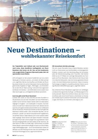 881 BEST OF BEST OF Zug Umgebung Portrait xxxNeue Destinationen %u2013 wohlbekannter ReisekomfortAdresse: Murer Busreisen GmbHGulmmatt 1, 6340 BaarTelefon: +41 41 760 73 83E-Mail: info@murer-reisen.chWeb: murer-reisen.chIn K%u00fcrze: Wohin auch immer Sie mit uns verreisen %u2013 Murer Reisen ist stets auf h%u00f6chste Qualit%u00e4tsstandards bedacht %u2013 bei der Organisation, bei den Fahrzeugen und auch bei den Fahrern. In diesem Sinne: Willkommen bei uns an Bord und geniessen Sie die Reise.Zur Tulpenbl%u00fcte nach Holland oder zum Wochenmarkt nach Luino, diese bew%u00e4hrten Ausflugsziele von Murer Busreisen sind immer ein Hit. Das auf die Kundenw%u00fcnsche ausgerichtete Programm %u00fcberrascht jedes Jahr mit spannenden neuen Reisen.%u00abOft schnappen wir bei unseren Ausfahrten auf, wo unsere G%u00e4ste gerne hinreisen w%u00fcrden, und setzen die Idee prompt um%u00bb, sagt Peter Zahner, Carchauffeur und Inhaber der Murer Busreisen GmbH. Ein auf die Interessen ihrer Kundschaft abgestimmtes Angebot an Tages-, Mehrtages- und Ferienfahrten ist dem Murer-Team wichtig. Yvonne Schmid organisiert die Reisen mit Herzblut %u2013 sie t%u00fcftelt dabei immer wieder neue %u00dcberraschungen aus und begleitet die Reisen pers%u00f6nlich. Auch das gibt es bei Murer Busreisen!%u00abLetztes Jahr waren wir das erste Mal auf einer Flussfahrt in Deutschland und auf einer Kreuzfahrt auf dem Mittelmeer%u00bb, erz%u00e4hlt Yvonne Schmid. Diesen Herbst steht ein besonderes Highlight im Angebot %u2013 ein Inselh%u00fcpfen in Kroatien. Auf einer exklusiv f%u00fcr die Murer-G%u00e4ste reservierten Yacht. Bereits die entspannte und zugleich erlebnisreiche Anfahrt im Car ist Bestandteil der Ferienreise. Mit dem Einchecken auf die Yacht geht das Abenteuer nahtlos weiter. %u00abDie versteckten Buchten, die wir ansteuern, werden von keinem Kreuzfahrtschiff angefahren%u00bb, verr%u00e4t Peter Zahner. Jeden Abend wird in einer anderen Hafenstadt angelegt. Diese k%u00f6nnen die G%u00e4ste entweder individuell auf eigene Faust oder unter kundiger F%u00fchrung entdecken. Nach Sonnenuntergang fi nden sich alle wieder auf der Yacht ein, die %u00fcber Nacht im Hafen vor Anker liegt. %u00abSchwimmen im kristallklaren Wasser, spannende Ausfl%u00fcge und wenn wir Gl%u00fcck haben, sogar Delfi nbegegnungen %u2013 durch die Kombination dieser Erlebnisse und die Erholung erinnert man sich nachhaltig an die herrlichen Ferientage zur%u00fcck%u00bb, sagt Yvonne Schmid.Mit innovativem Antrieb unterwegsMit dem neuen Mercedes Intouro Hybrid Reisebus werden nicht nur Ferienreisen zum komfortablen und %u00f6kologischen Erlebnis, sondern auch der Vereinsausflug, die Schulreise oder der Wochenendausflug unter Freunden. Seit Herbst 2024 ist der 37-Pl%u00e4tzer ein wichtiger Bestandteil des Fuhrparks von Murer Busreisen. %u00abDas Herzst%u00fcck des Intouro Hybrid ist das Antriebssystem, das einen leistungsstarken Dieselmotor mit einem Elektromotor kombiniert. Diese innovative Technologie erm%u00f6glicht umweltfreundliches Fahren durch signifi kante Kraftstoffeinsparungen%u00bb, sagt Peter Zahner. Das erfahrene Murer-Reiseteam organisiert ein vielf%u00e4ltiges und abwechslungsreiches Ausflugs- und Reiseprogramm f%u00fcr die Kundschaft. Planen Sie mit Ihrem Verein oder Ihrer Firma eine Reise oder einen Event? Gerne unterst%u00fctzen wir Sie bei der Umsetzung mit unserem Fachwissen und unseren Erfahrungen. Wir freuen uns mit Ihnen unterwegs zu sein.
