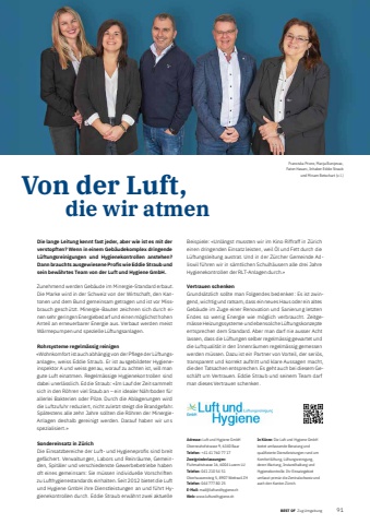 BEST OF Zug Umgebung 91BEST OF Portrait xxx 1Von der Luft, die wir atmen Die lange Leitung kennt fast jeder, aber wie ist es mit der verstopften? Wenn in einem Geb%u00e4udekomplex dringende L%u00fcftungsreinigungen und Hygienekontrollen anstehen? Dann brauchts ausgewiesene Profi s wie Eddie Straub und sein bew%u00e4hrtes Team von der Luft und Hygiene GmbH.Zunehmend werden Geb%u00e4ude im Minergie-Standard erbaut. Die Marke wird in der Schweiz von der Wirtschaft, den Kantonen und dem Bund gemeinsam getragen und ist vor Missbrauch gesch%u00fctzt. Minergie-Bauten zeichnen sich durch einen sehr geringen Energiebedarf und einen m%u00f6glichst hohen Anteil an erneuerbarer Energie aus. Verbaut werden meist W%u00e4rmepumpen und spezielle L%u00fcftungsanlagen.Rohrsysteme regelm%u00e4ssig reinigen%u00abWohnkomfort ist auch abh%u00e4ngig von der Pflege der L%u00fcftungsanlage%u00bb, weiss Eddie Straub. Er ist ausgebildeter Hygieneinspektor A und weiss genau, worauf zu achten ist, will man gute Luft einatmen. Regelm%u00e4ssige Hygienekontrollen sind dabei unerl%u00e4sslich. Eddie Straub: %u00abIm Lauf der Zeit sammelt sich in den R%u00f6hren viel Staub an %u2013 ein idealer N%u00e4hrboden f%u00fcr allerlei Bakterien oder Pilze. Durch die Ablagerungen wird die Luftzufuhr reduziert, nicht zuletzt steigt die Brandgefahr. Sp%u00e4testens alle zehn Jahre sollten die R%u00f6hren der MinergieAnlagen deshalb gereinigt werden. Darauf haben wir uns spezialisiert.%u00bbSondereinsatz in Z%u00fcrichDie Einsatzbereiche der Luft- und Hygieneprofi s sind breit gef%u00e4chert. Verwaltungen, Labors und Reinr%u00e4ume, Gemeinden, Spit%u00e4ler und verschiedenste Gewerbebetriebe haben oft eines gemeinsam: Sie m%u00fcssen individuelle Vorschriften zu Lufthygienestandards einhalten. Seit 2012 bietet die Luft und Hygiene GmbH ihre Dienstleistungen an und f%u00fchrt Hygienekontrollen durch. Eddie Straub erw%u00e4hnt zwei aktuelle Beispiele: %u00abUnl%u00e4ngst mussten wir im Kino Riffraff in Z%u00fcrich einen dringenden Einsatz leisten, weil %u00d6l und Fett durch die L%u00fcftungsleitung austrat. Und in der Z%u00fcrcher Gemeinde Adliswil f%u00fchren wir in s%u00e4mtlichen Schulh%u00e4usern alle drei Jahre Hygienekontrollen der RLT-Anlagen durch.%u00bbVertrauen schenkenGrunds%u00e4tzlich sollte man Folgendes bedenken: Es ist zwingend, wichtig und ratsam, dass ein neues Haus oder ein altes Geb%u00e4ude im Zuge einer Renovation und Sanierung letzten Endes so wenig Energie wie m%u00f6glich verbraucht. Zeitgem%u00e4sse Heizungssysteme und ebensolche L%u00fcftungskonzepte entsprechen dem Standard. Aber man darf nie ausser Acht lassen, dass die L%u00fcftungen selber regelm%u00e4ssig gewartet und die Luftqualit%u00e4t in den Innenr%u00e4umen regelm%u00e4ssig gemessen werden m%u00fcssen. Dazu ist ein Partner von Vorteil, der seri%u00f6s, transparent und korrekt auftritt und klare Aussagen macht, die den Tatsachen entsprechen. Es geht auch bei diesem Gesch%u00e4ft um Vertrauen. Eddie Straub und seinem Team darf man dieses Vertrauen schenken. Adresse: Luft und Hygiene GmbHOberneuhofstrasse 9, 6340 BaarTelefon: +41 41 760 77 17Zweigniederlassungen:Fluhmattstrasse 16, 6004 Luzern LUTelefon: 041 210 54 51 Oberhausensteig 5, 8907 Wettswil ZHTelefon: 044 777 80 25 E-Mail: mail@luftundhygiene.chWeb: www.luftundhygiene.chIn K%u00fcrze: Die Luft und Hygiene GmbH bietet umfassende Beratung und qualifi zierte Dienstleistungen rund um Komfortl%u00fcftung, L%u00fcftungsreinigung, deren Wartung, Instandhaltung und Hygienekontrolle. Ihr Einsatzgebiet umfasst prim%u00e4r die Zentralschweiz und auch den Kanton Z%u00fcrich.Franciska Priore, Marija Bunijevac, Faton Hasani, Inhaber Eddie Straub und Miriam Betschart (v. l.)