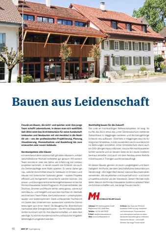 921 BEST OF BEST OF Zug Umgebung Portrait xxxBauen aus LeidenschaftAdresse: MH Hochbauatelier GmbHBlegistrasse 11A, 6340 BaarTelefon: +41 56 666 28 00 E-Mail: info@hochbauatelier.chWeb: www.hochbauatelier.chIn K%u00fcrze: Das Team der MH Hochbauatelier GmbH ist jung, kompetent und hochmotiviert. Praxisorientiert und unkompliziert realisiert es neben Neubauten besonders ger ne Umbauten historischer H%u00e4user %u2013 und schafft Sch%u00f6nes, das lange Freude macht.Freude am Bauen, die sicht- und sp%u00fcrbar wird: Das junge Team schafft Lebensr%u00e4ume, in denen man sich wohlf%u00fchlt. Seit 2014 setzt das Architekturb%u00fcro f%u00fcr seine Kundschaft Umbauten und Neubauten mit viel Herzblut in die Realit%u00e4t um %u2013 von der professionellen Projektierung, Planung, Visualisierung, Massaufnahme und Bauleitung bis zum erneuerten oder neuen Geb%u00e4ude. Kernkompetenz alte H%u00e4user%u00abUnsere besondere Leidenschaft gilt alten H%u00e4usern%u00bb, erkl%u00e4rt Gesch%u00e4ftsf%u00fchrer Michael Hofstetter gut gelaunt. Mit seinem Team konnte er %u00fcber die Jahre viel Erfahrung mit Umbauprojekten sammeln, in denen sowohl die Ortsbild- als auch die Denkmalpflege eine Rolle spielten. Er weiss daher genau, welche Vorschriften etwa f%u00fcr Geb%u00e4ude im Ortskern und H%u00e4user mit historischer Substanz gelten %u2013 sodass Projekte effi zient und fachgerecht verwirklicht werden k%u00f6nnen. Die praxis- und l%u00f6sungsorientierte Herangehensweise ist bei der MH Hochbauatelier GmbH Programm. Michael Hofstetter, der Zeichner, Stromer und Maurer lernte, weiss genau, wie es auf dem Bau zu- und hergeht und was real machbar ist. Deshalb zeichnet sein Team Pl%u00e4ne, die funktionieren %u2013 unkompliziert, sauber und kostenoptimiert. Dank umfassender Fachkenntnis bietet das Unternehmen ausserdem s%u00e4mtliche Dienstleistungen aus einer Hand: Ob Baugesuche, Brandschutznachweise oder Energienachweise %u2013 die MH Hochbauatelier GmbH k%u00fcmmert sich f%u00fcr ihre Bauherrschaften um alles Notwendige. So k%u00f6nnen Kundenw%u00fcnsche und bauliche Vorgaben bestm%u00f6glich umgesetzt werden.Nachhaltig bauen f%u00fcr die Zukunft Die Liste an hochkar%u00e4tigen Referenzobjekten ist lang: So durfte das B%u00fcro etwa das unter Denkmalschutz stehende Dubachhaus in H%u00e4gglingen sanieren und die dazugeh%u00f6rige Scheune neu aufbauen. Ebenfalls in H%u00e4gglingen baut es f%u00fcr Volg einen Ersatzbau, in dem ausserdem sechs wundersch%u00f6ne Wohnungen entstehen. Unter Ortsbildschutz stand auch ein 100-j%u00e4hriges Haus in B%u00fcnzen, das die MH Hochbauatelier GmbH sanierte und an dessen Seite es ein neues Dreifamilienhaus erstellte. Und auch mit dem Neubau eines Mehrfamilienhauses in Triengen wurde sie beauftragt.All diesen Bauten gemein ist deren Lang lebigkeit und Nachhaltigkeit: ein Punkt, der dem Gesch%u00e4ftsf%u00fchrer besonders am Herzen liegt. %u00abWir legen Wert darauf, dass wir Baumaterialien verwenden, die rezyklierbar und dauerhaft sind %u2013 und damit umweltfreundlicher als der Standard%u00bb, betont Michael Hofstetter. Warum die MH Hochbauatelier GmbH so arbeitet? Weil sie Sch%u00f6nes schaffen will, das lange Freude macht.