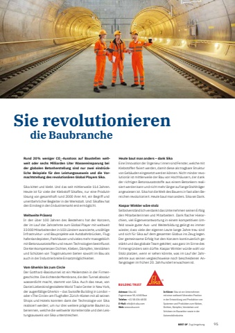 BEST OF Zug Umgebung 95BEST OF Portrait xxx 1Sie revolutionieren die BaubrancheAdresse: Sika AGZugerstrasse 50, 6340 BaarTelefon: +41 58 436 68 00E-Mail: info@ch.sika.comWeb: www.sika.comIn K%u00fcrze: Sika ist ein Unternehmen mit einer weltweit f%u00fchrenden Position in der Entwicklung und Produktion von Systemen und Produkten zum Kleben, Dichten, D%u00e4mpfen, Verst%u00e4rken und Sch%u00fctzen im Bausektor sowie in der Automobilindustrie. Rund 20 % weniger CO2-Ausstoss auf Baustellen weltweit oder sechs Milliarden Liter Wassereinsparung bei der globalen Betonherstellung sind nur zwei eindr%u00fcckliche Beispiele f%u00fcr den Leistungsausweis und die Vormachtstellung des revolution%u00e4ren Global Players Sika. Sika kittet und klebt. Und das seit mittlerweile 114 Jahren. Heute ist f%u00fcr viele der Klebstoff Sikaflex, nur eine Produktl%u00f6sung von gesamthaft rund 2000 ihrer Art, ein Begriff und unentbehrlicher Begleiter in der Werkstatt. Und: Sikaflex hat den Einstieg in den Industriemarkt erst erm%u00f6glicht.Weltweite Pr%u00e4senzIn den %u00fcber 100%u00a0 Jahren des Bestehens hat der Konzern, der im Lauf der Jahrzehnte zum Global Player mit weltweit 33 000%u00a0Mitarbeitenden in 103%u00a0L%u00e4ndern avancierte, unz%u00e4hlige Infrastruktur- und Bauprojekte wie Autobahnbr%u00fccken, Flughafenlandepisten, Parkh%u00e4user und vieles mehr massgeblich mit Betonzusatzstoffen und neuen Technologien beeinflusst. Die Kernkompetenzen Dichten, Kleben, D%u00e4mpfen, Verst%u00e4rken und Sch%u00fctzen von Tragstrukturen bieten sowohl im Bau als auch in der Industrie breite Einsatzm%u00f6glichkeiten. Vom Gherkin bis zum CircleDer Gotthard-Basistunnel ist ein Meilenstein in der Firmengeschichte. Die dichtende Membrane, die den Tunnel absolut wasserdicht macht, stammt von Sika. Auch das neue, von Daniel Liebeskind gestaltete World Trade Center in New York, der augenf%u00e4llige Gherkin %u2013 das SwissRe Building in London %u2013 oder %u00abThe Circle%u00bb am Flughafen Z%u00fcrich-Kloten mit all seinen Shops und Hotels konnten dank der Technologie von Sika realisiert werden; um nur drei weitere pr%u00e4gnante Bauten zu benennen, welche die weltweite Vorreiterrolle und den Leistungsausweis von Sika unterstreichen. Heute baut man anders %u2013 dank SikaEine Innovation der Ingenieur:innen sind Fenster, welche mit Klebstoffen fi xiert werden, damit diese als tragbare Struktur von Geb%u00e4uden eingesetzt werden k%u00f6nnen. Nicht minder revolution%u00e4r ist mittlerweile der Bau von Hochh%u00e4usern, der dank der richtigen Betonzusatzstoffe aus einem Betonkern realisiert werden kann und nicht mehr l%u00e4nger auf lange Stahltr%u00e4ger angewiesen ist. Sika hat die Welt des Bauens in fast allen Bereichen revolutioniert. Heute baut man anders. Sika sei Dank.Kaspar Winkler w%u00e4re stolzSelbstverst%u00e4ndlich verdankt das Unternehmen seinen Erfolg den Mitarbeiterinnen und Mitarbeitern. Dank flacher Hierarchien, viel Eigenverantwortung in einem kompetitiven Umfeld sowie guter Aus- und Weiterbildung gelingt es immer wieder, dass viele der eigenen Leute lange Jahre treu sind und sich f%u00fcr Sika auf dem gesamten Globus ins Zeug legen. Der gemeinsame Erfolg hat den Konzern kontinuierlich gest%u00e4rkt und das globale Team gekittet; was ganz im Sinne des Firmengr%u00fcnders sein d%u00fcrfte. Kaspar Winkler w%u00fcrde wohl vor Stolz platzen, wenn er sehen k%u00f6nnte, was im Lauf der Jahrzehnte aus seinen vergleichsweise noch bescheidenen Anfangstagen im fr%u00fchen 20.%u00a0Jahrhundert erwachsen ist.