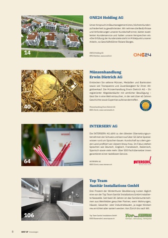 18 BEST OF BEST OF Teaser VoranzeigenTop TeamSanit%u00e4r Installations GmbHDrei Prozent der Winterthurer Bev%u00f6lkerung nutzen t%u00e4glich eine von der Top Team Sanit%u00e4r Installations GmbH installierte Nasszelle. Seit bald 30 Jahren ist das Familienunternehmen aus Weinfelden gesuchter Partner, wenn Wohnungen, H%u00e4user, Gewerbe- oder Industriebauten, ja sogar Kliniken neu errichtet oder saniert werden. Von Z%u00fcrich bis nach Wil. Top Team Sanit%u00e4r Installations GmbH8303 Bassersdorf, www.topsan.ch106INTERSERV AGDie INTERSERV AG z%u00e4hlt zu den %u00e4ltesten %u00dcbersetzungsunternehmen der Schweiz und kann auf %u00fcber 50 Jahre Spezialwissen rund um Sprachen bauen. Kundschaft aus dem ganzen Land profi tiert von diesem Know-how. Im Fokus stehen Sprachen wie Deutsch, Englisch, Franz%u00f6sisch, Italienisch, Spanisch sowie viele mehr. %u00dcber 500%u00a0Fach%u00fcbersetzer:innen garantieren einen tadellosen Service.INTERSERV AG8003 Z%u00fcrich, www.interserv.ch64M%u00fcnzenhandlung Erwin Dietrich AGEntdecken Sie seltene M%u00fcnzen, Medaillen und Banknoten sowie viel Transparenz und Zuverl%u00e4ssigkeit f%u00fcr Ihren Altgoldverkauf. Die M%u00fcnzenhandlung Erwin Dietrich AG %u2013 Ihr registrierter Altgoldank%u00e4ufer mit amtlicher Bewilligung %u2013 l%u00e4sst Sie in eine Welt eintauchen, in der seit %u00fcber 60 Jahren Geschichte sowie Expertise aufeinandertreffen.M%u00fcnzenhandlung Erwin Dietrich AG8001 Z%u00fcrich, www.numismatik.ch40ONE24 Holding AGUnser Anspruch im Baumanagement ist es, h%u00f6chste Kundenzufriedenheit zu gew%u00e4hrleisten. Wir nehmen die Bed%u00fcrfnisse und Anforderungen unserer Kundschaft ernst, bieten exzellenten Kundenservice und halten unsere Versprechen ein. %u00abDie Erf%u00fcllung der Kundenziele steht im Mittelpunkt unserer Arbeit%u00bb, so Gesch%u00e4ftsf%u00fchrer Roland Borges.ONE24 Holding AG8953 Dietikon, www.one24.ch14