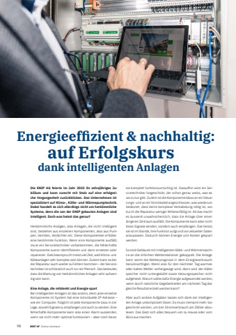 198 BEST OF BEST OF Portrait xxx Z%u00fcrcher UnterlandEnergieeffi zient & nachhaltig: auf Erfolgskurs dank intelligenten AnlagenDie ENIP AG feierte im Jahr 2023 ihr zehnj%u00e4hriges Jubil%u00e4um und kann zurecht mit Stolz auf eine erfolgreiche Vergangenheit zur%u00fcckblicken. Das Unternehmen ist spezialisiert auf Klima-, K%u00e4lte- und W%u00e4rmepumptechnik. Dabei handelt es sich allerdings nicht um herk%u00f6mmliche Systeme, denn die von der ENIP gebauten Anlagen sind intelligent. Doch was heisst das genau?Herk%u00f6mmliche Analgen, also Anlagen, die nicht intelligent sind, bestehen aus einzelnen Komponenten, also aus Pumpen, Ventilen, Verdichter etc. Diese Komponenten erf%u00fcllen eine bestimmte Funktion. Wenn eine Komponente ausf%u00e4llt, muss ein Servicetechniker vorbeikommen, die fehlerhafte Komponente zuerst identifi zieren und dann ersetzen oder reparieren. Dies beansprucht meist viel Zeit, weil Klima- und K%u00e4lteanlagen sehr komplex sein k%u00f6nnen. Zudem kann es bei der Reparatur auch wieder zu Fehlern kommen %u2013 der Servicetechniker ist schliesslich auch nur ein Mensch. Das bedeutet, dass die Wartung von herk%u00f6mmlichen Anlagen sehr aufwendig sein kann. Eine Anlage, die mitdenkt und Energie spartBei intelligenten Anlagen ist das anders, denn jede einzelne Komponente im System hat eine individuelle IP-Adresse %u2013 wie ein Computer. Folglich ist jede Komponente dazu in der Lage, sowohl Signale zu empfangen und auch zu senden. Eine fehlerhafte Komponente kann also einen Alarm aussenden, wenn sie nicht mehr optimal funktioniert %u2013 aber noch bevor sie komplett funktionsunt%u00fcchtig ist. Daraufhin wird ein Servicetechniker losgeschickt, der schon genau weiss, was es wo zu tun gibt. Zudem ist die Komponente bloss an ein Steuerungs- und an ein Stromkabel angeschlossen, was wiederum bedeutet, dass keine komplexe Verkabelung n%u00f6tig ist, wodurch die Reparatur weniger fehleranf%u00e4llig ist. All das macht es %u00e4usserst unwahrscheinlich, dass die Anlage %u00fcber einen l%u00e4ngeren Zeitraum ausf%u00e4llt. Die Komponente kann aber nicht bloss Signale senden, sondern auch empfangen. Das heisst, sie ist im Stande, ihre Funktion aufgrund von aktuellen Daten anzupassen. Dadurch k%u00f6nnen Energie und Kosten gespart werden. So sind Geb%u00e4ude mit intelligenten K%u00e4lte- und W%u00e4rmemaschine an die %u00f6rtlichen Wetterstationen gekoppelt. Die Anlage kann somit die Wetterprognose in dem Energieverbrauch ber%u00fccksichtigen. Wenn also f%u00fcr den n%u00e4chsten Tag warmes oder kaltes Wetter vorhergesagt wird, dann wird der K%u00e4ltespeicher nicht runtergek%u00fchlt sowie Heizungsspeicher nicht aufgeheizt. Warum sollte daf%u00fcr Energie aufgewendet werden, wenn durch nat%u00fcrliche Gegebenheiten am n%u00e4chsten Tag das gleiche Resultat erzielt werden kann? Aber auch andere Aufgaben lassen sich dank der intelligenten Anlage unkompliziert l%u00f6sen. So muss niemand mehr losgeschickt werden, um den Stromverbrauch am Z%u00e4hler abzulesen. Das l%u00e4sst sich alles bequem von zu Hause oder vom B%u00fcro aus machen.