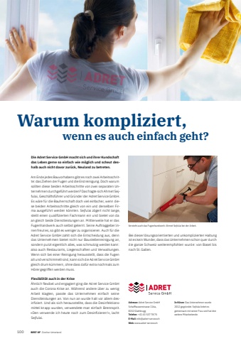 100 BEST OF BEST OF Portrait xxx Z%u00fcrcher UnterlandWarum kompliziert, wenn es auch einfach geht?Die Adret Service GmbH macht sich und ihrer Kundschaft das Leben gerne so einfach wie m%u00f6glich und scheut deshalb auch nicht davor zur%u00fcck, Neuland zu betreten.Am Ende jedes Bauvorhabens gibt es noch zwei Arbeitsschritte: das Ziehen der Fugen und die Endreinigung. Doch warum sollten diese beiden Arbeitsschritte von zwei separaten Unternehmen durchgef%u00fchrt werden? Das fragte sich Ahmet Sejfulai, Gesch%u00e4ftsf%u00fchrer und Gr%u00fcnder der Adret Service GmbH. Es w%u00e4re f%u00fcr die Bauherrschaft doch viel einfacher, wenn diese beiden Arbeitsschritte gleich von ein und derselben Firma ausgef%u00fchrt werden k%u00f6nnten. Sejfulai z%u00f6gert nicht lange, stellt einen qualifi zierten Fachmann ein und bietet von da an gleich beide Dienstleistungen an. Mittlerweile hat er das Fugenhandwerk auch selbst gelernt. Seine Auftraggeber:innen freut es, so gibt es weniger zu organisieren. Auch f%u00fcr die Adret Service GmbH zahlt sich die Entscheidung aus, denn das Unternehmen bietet nicht nur Baustellenreinigung an, sondern putzt eigentlich alles, was schmutzig werden kann: also auch Restaurants, Liegenschaften und Verwaltungen. Wenn sich bei einer Reinigung herausstellt, dass die Fugen alt und verschimmelt sind, kann sich die Adret Service GmbH gleich drum k%u00fcmmern, ohne dass daf%u00fcr extra nochmals zum H%u00f6rer gegriffen werden muss. Flexibilit%u00e4t auch in der Krise%u00c4hnlich flexibel und engagiert ging die Adret Service GmbH auch die Corona Krise an. W%u00e4hrend andere %u00fcber zu wenig Arbeit klagten, passte das Unternehmen einfach seine Dienstleistungen an. Von nun an wurde halt vor allem desinfi ziert. Und als sich herausstellte, dass die Desinfektionsmittel knapp wurden, verwendete man einfach Brennsprit. %u00abDen verwende ich heute noch zum Desinfi zieren!%u00bb, lacht Sejfulai.Bei dieser l%u00f6sungsorientierten und unkomplizierten Haltung ist es kein Wunder, dass das Unternehmen schon quer durch die ganze Schweiz weiterempfohlen wurde: von Basel bis nach St.%u00a0Gallen. Adresse: Adret Service GmbHSchaffhauserstrasse 116a, 8152 GlattbruggTelefon: +41 43 537 78 75E-Mail: info@adret-service.chWeb: www.adret-service.chIn K%u00fcrze: Das Unternehmen wurde 2012 gegr%u00fcndet. Sejfulai leitet es gemeinsam mit seiner Frau und hat drei weitere Mitarbeitende. Versteht auch das Fugenhandwerk: Ahmet Sejfulai bei der Arbeit.