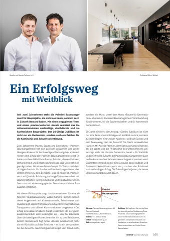 BEST OFBEST OF Z%u00fcrcher Unterland Portrait xxx 1054Ein Erfolgsweg mit WeitblickAdresse: Palmieri Baumanagement AGZentrum RiedparkZ%u00fcrcherstrasse 17, 8173 NeerachTelefon: +41 43 411 00 31E-Mail: info@palmieri-ag.chWeb: www.palmieri-ag.chIn K%u00fcrze: Wir begleiten Sie von der Idee bis zur erfolgreichen Realisierung Ihres Projektes. Unser Leistungsspektrum reicht vom Einfamilienhaus bis hin zu gr%u00f6sseren komplexen Umbauten und Neubauten in verschiedenen Bereichen. Gerne unterst%u00fctzen wir Sie bei Ihrem Bauvorhaben!Seit zwei Jahrzehnten steht die Palmieri Baumanagement f%u00fcr Bauprojekte, die nicht nur heute, sondern auch in Zukunft Bestand haben. Mit einem engagierten Team und einem praxisorientierten Ansatz realisiert das Familienunternehmen nachhaltige, durchdachte und zukunftssichere Bauprojekte. Das 20-j%u00e4hrige Jubil%u00e4um ist nicht nur ein Meilenstein, sondern auch ein Zeichen f%u00fcr die Kontinuit%u00e4t und Zukunftsorientierung.Zwei Jahrzehnte Planen, Bauen und Entwickeln %u2013 Palmieri Baumanagement hat sich zu einer bew%u00e4hrten und zuverl%u00e4ssigen Adresse f%u00fcr hochwertigen Wohnungsbau etabliert. Hinter dem Erfolg der Palmieri Baumanagement steht Inhaber und Gesch%u00e4ftsf%u00fchrer Sandro Palmieri, dessen Visionen, Beharrlichkeit und Entscheidungsfreude das Unternehmen gepr%u00e4gt haben. Mit einem feinen Gesp%u00fcr f%u00fcr Trends und dem richtigen Instinkt f%u00fcr fundierte Entscheidungen hat er das Unternehmen zu dem gemacht, was es heute ist. Palmieri setzt auf Qualit%u00e4t, Erfahrung und enge Zusammenarbeit mit Bauherrschaften, Architekturb%u00fcros und Handwerker:innen. Denn nur mit einem engagierten Team kann h%u00f6chste Bauqualit%u00e4t entstehen. Mit dieser Philosophie sorgt das Unternehmen f%u00fcr eine effi ziente Projektabwicklung, wobei Sandro Palmieri besonderes Augenmerk auf Kostenkontrolle, Termintreue und Qualit%u00e4t legt. Jedes Wohnbauprojekt wird mit Pragmatismus, Transparenz und offener Kommunikation umgesetzt. %u00abDer Erfolg eines Bauvorhabens h%u00e4ngt wesentlich von der guten Zusammenarbeit aller Beteiligten ab %u2013 von der Baustelle %u00fcber die beteiligten Planer:innen bis hin zu den Beh%u00f6rden%u00bb, betont Palmieri und f%u00fcgt hinzu: %u00abDieses Jubil%u00e4um ist mehr als ein R%u00fcckblick auf das Erreichte %u2013 es ist ein Versprechen f%u00fcr die Zukunft%u00bb. Nachhaltigkeit ist l%u00e4ngst kein Trend mehr, sondern ein Muss. Unter dem Motto %u00abBauen f%u00fcr Generationen%u00bb %u00fcbernimmt Palmieri Baumanagement Verantwortung f%u00fcr die Umwelt, f%u00fcr die Bauherrschaften und f%u00fcr kommende Generationen.20 Jahre sind erst der Anfang. %u00abDieses Jubil%u00e4um ist nicht nur eine Feier unserer Erfolge und ein Blick zur%u00fcck, sondern auch der Beginn eines neuen Kapitels%u00bb, sind sich Sandro und sein Team einig. Und die Zukunft? Die bleibt in bew%u00e4hrten H%u00e4nden. Mit Aurelio Palmieri, dem Sohn von Sandro Palmieri, der die Werte und die Philosophie des Unternehmens weitertr%u00e4gt, steht die n%u00e4chste Generation bereit %u2013 f%u00fcr Stabilit%u00e4t und eine frische Zukunft, die Palmieri Baumanagement auch in den kommenden Jahrzehnten erfolgreich machen wird. Das Unternehmen beweist eindrucksvoll, dass Tradition und Innovation kein Widerspruch sind, sondern der Schl%u00fcssel zum nachhaltigen Erfolg. Die Zukunft geh%u00f6rt jenen, die heute verantwortungsbewusst bauen.Aurelio und Sandro Palmieri (v. l.) Exklusive Villa in Winkel