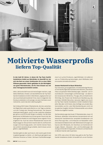 106 BEST OF Portrait xxxMotivierte Wasserprofi s liefern Top-Qualit%u00e4tIn den bald 30 Jahren, in denen die Top Team Sanit%u00e4r Installations GmbH aus Weinfelden im Gesch%u00e4ft ist, hat sich das Bad von einem funktionalen Ort zu einer Wohlf%u00fchloase gewandelt. Gleich geblieben ist die Wichtigkeit von guten Mitarbeitenden, die f%u00fcr ihren Einsatz nun mit einer Viertagewoche belohnt werden.%u00abNein, die Kundschaft muss sich keine Sorgen machen%u00bb, sagt Stefan Wildhaber, Inhaber und Gesch%u00e4ftsf%u00fchrer der Top Team Sanit%u00e4r Installations GmbH in Weinfelden, angesprochen auf das neue Arbeitszeitmodell der Firma. Ganz im Gegenteil. Die Monteure arbeiteten nicht weniger, sie seien h%u00f6chstens noch motivierter, %u00abwenn das denn %u00fcberhaupt geht%u00bb.Seit Anfang 2023 haben Mitarbeitende, die dies w%u00fcnschen, die M%u00f6glichkeit, jede zweite Woche nur vier Tage zu arbeiten, und den Freitag oder Montag freizunehmen. Die Gesamtarbeitszeit bleibt gleich, sprich an den restlichen Arbeitstagen gilt es rund 50 Minuten l%u00e4nger zu arbeiten. Auf die Idee gekommen ist Wildhaber durch einen guten Freund, der das exakt gleiche Modell mit viel Erfolg bei seiner eigenen Firma eingef%u00fchrt hat. Auch bei seinen Mitarbeitenden kommt die Neuerung gut an. Bis auf einen machen alle mit, die R%u00fcckmeldungen sind durchwegs positiv. %u00abIch m%u00f6chte meinem Team, das wirklich sensationell gut arbeitet, damit etwas zur%u00fcckgeben%u00bb, sagt Wildhaber.Daneben gehe es aber auch darum, den Leuten gute Anstellungsbedingungen zu bieten, um %u00fcberhaupt gen%u00fcgend qualifi ziertes Personal zu fi nden. Stichwort Fachkr%u00e4fte mangel. %u00abAuch wir suchen Monteure%u00bb, sagt Wildhaber. Um selbst etwas zur Probleml%u00f6sung beizutragen, plant Wildhaber, bald eine zweite Lehrstelle anzubieten.Grosser Marktanteil im Raum WinterthurTop motivierte, gut ausgebildete und selbstst%u00e4ndige Monteure sind das R%u00fcckgrat des Familienunternehmens, das seinen Fokus auf gr%u00f6ssere Wohn%u00fcberbauungen, Gewerbe- und Industriebauten, Grossanlagen und Kliniken legt %u2013 vor allem in den Grossr%u00e4umen Winterthur, Thurgau, Wil und Stadt Z%u00fcrich. Mit Erfolg. Drei Prozent der Winterthurer Bev%u00f6lkerung, das sind %u00fcber 100 000 Menschen, benutzen t%u00e4glich eine durch die Top Team Sanit%u00e4r Installations GmbH installierte Nasszelle. Was aber nicht heisst, dass Auftr%u00e4ge von privaten Bauherrschaften von Ein- oder Mehrfamilienh%u00e4usern nicht mit der gleichen Sorgfalt, h%u00f6chster Professionalit%u00e4t und zu fairen Preisen durchgef%u00fchrt werden. Die Dienstleistungen des heute 17 Mitarbeitenden, davon 13 Monteure, z%u00e4hlenden Unternehmens konzentrieren sich auf klassischen Sanit%u00e4rbereiche: komplette Installationen und deren Planung in Neu- und Umbauten von Nasszellen: seien dies klassische Badezimmer oder Wellnesseinrichtungen wie Saunas oder Whirlpools, der Anschluss von K%u00fccheneinrichtungen, Wasser-, Abwasser-, Gas- und Druckleitungen, Beratung und Handel mit Apparaten, Armaturen und Garnituren im Bereich Sanit%u00e4r oder Expertisen.Seit 1995, also schon 30 Jahre lang, gibt es die Top Team Sanit%u00e4r Installations GmbH. Es handelt sich um ein FamilienBEST OF Z%u00fcrcher Unterland