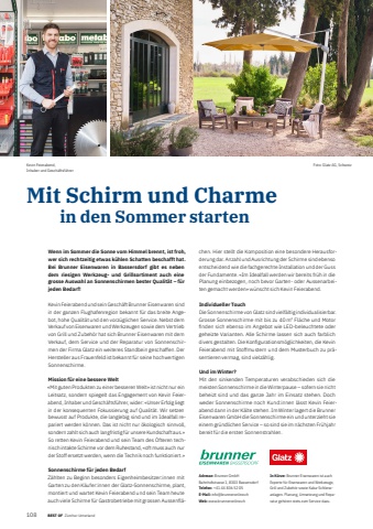 108 BEST OF BEST OF Portrait xxx Z%u00fcrcher UnterlandMit Schirm und Charme in den Sommer startenWenn im Sommer die Sonne vom Himmel brennt, ist froh, wer sich rechtzeitig etwas k%u00fchlen Schatten beschafft hat. Bei Brunner Eisenwaren in Bassersdorf gibt es neben dem riesigen Werkzeug- und Grillsortiment auch eine grosse Auswahl an Sonnenschirmen bester Qualit%u00e4t %u2013 f%u00fcr jeden Bedarf!Kevin Feierabend und sein Gesch%u00e4ft Brunner Eisenwaren sind in der ganzen Flughafenregion bekannt f%u00fcr das breite Angebot, hohe Qualit%u00e4t und den vorz%u00fcglichen Service. Nebst dem Verkauf von Eisenwaren und Werkzeugen sowie dem Vertrieb von Grill und Zubeh%u00f6r hat sich Brunner Eisenwaren mit dem Verkauf, dem Service und der Reparatur von Sonnenschirmen der Firma Glatz ein weiteres Standbein geschaffen. Der Hersteller aus Frauenfeld ist bekannt f%u00fcr seine hochwertigen Sonnenschirme. Mission f%u00fcr eine bessere Welt%u00abMit guten Produkten zu einer besseren Welt%u00bb ist nicht nur ein Leitsatz, sondern spiegelt das Engagement von Kevin Feierabend, Inhaber und Gesch%u00e4ftsf%u00fchrer, wider: %u00abUnser Erfolg liegt in der konsequenten Fokussierung auf Qualit%u00e4t. Wir setzen bewusst auf Produkte, die langlebig sind und im Idealfall repariert werden k%u00f6nnen. Das ist nicht nur %u00f6kologisch sinnvoll, sondern zahlt sich auch langfristig f%u00fcr unsere Kundschaft aus.%u00bb So retten Kevin Feierabend und sein Team des %u00d6fteren technisch intakte Schirme vor dem Ruhestand, %u00aboft muss auch nur der Stoff ersetzt werden, wenn die Technik noch funktioniert.%u00bb Sonnenschirme f%u00fcr jeden BedarfZ%u00e4hlten zu Beginn besonders Eigenheimbesitzer:innen mit Garten zu den K%u00e4ufer:innen der Glatz-Sonnenschirme, plant, montiert und wartet Kevin Feierabend und sein Team heute auch viele Schirme f%u00fcr Gastrobetriebe mit grossen Aussenfl%u00e4chen. Hier stellt die Komposition eine besondere Herausforderung dar. Anzahl und Ausrichtung der Schirme sind ebenso entscheidend wie die fachgerechte Installation und der Guss der Fundamente. %u00abIm Idealfall werden wir bereits fr%u00fch in die Planung einbezogen, noch bevor Garten- oder Aussenarbeiten gemacht werden%u00bb w%u00fcnscht sich Kevin Feierabend. Individueller TouchDie Sonnenschirme von Glatz sind vielf%u00e4ltig individualisierbar. Grosse Sonnenschirme mit bis zu 40 m2 Fl%u00e4che und Motor fi nden sich ebenso im Angebot wie LED-beleuchtete oder geheizte Varianten. Alle Schirme lassen sich auch farblich divers gestalten. Die Konfi gurationsm%u00f6glichkeiten, die Kevin Feierabend mit Stoffmustern und dem Musterbuch zu pr%u00e4sentieren vermag, sind vielz%u00e4hlig. Und im Winter?Mit den sinkenden Temperaturen verabschieden sich die meisten Sonnenschirme in die Winterpause %u2013 sofern sie nicht beheizt sind und das ganze Jahr im Einsatz stehen. Doch weder Sonnenschirme noch Kund:innen l%u00e4sst Kevin Feierabend dann in der K%u00e4lte stehen. Im Winter lagert die Brunner Eisenwaren GmbH die Sonnenschirme ein und unterzieht sie einem gr%u00fcndlichen Service %u2013 so sind sie im n%u00e4chsten Fr%u00fchjahr bereit f%u00fcr die ersten Sonnenstrahlen.Adresse: Brunner GmbHBahnhofstrasse 1, 8303 BassersdorfTelefon: +41 44 836 52 05E-Mail: info@brunneronline.chWeb: www.brunneronline.chIn K%u00fcrze: Brunner Eisenwaren ist auch Experte f%u00fcr Eisenwaren und Werkzeuge, Grill und Zubeh%u00f6r sowie Kaba-Schliessanlagen. Planung, Umsetzung und Reparatur geh%u00f6ren stets zum Service dazu.Kevin Feierabend, Inhaber und Gesch%u00e4ftsf%u00fchrerFoto: Glatz AG, Schweiz