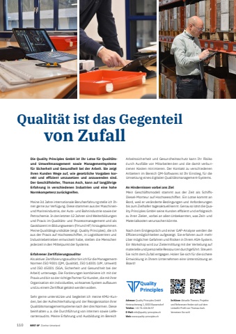 110 BEST OF BEST OF Portrait xxx Z%u00fcrcher UnterlandQualit%u00e4t ist das Gegenteil von ZufallAdresse: Quality Principles GmbHHinteracherweg 1, 8303 BassersdorfTelefon: +41 76 426 06 57E-Mail: info@quality-principles.chWeb: www.quality-principles.ch In K%u00fcrze: Aktuelle Themen, Projekte und Referenzen fi nden sich auf dem LinkedIn-Profi l von Thomas Asch. Vernetzen Sie sich!Die Quality Principles GmbH ist Ihr Lotse f%u00fcr Qualit%u00e4tsund Umweltmanagement sowie Managementsysteme f%u00fcr Sicherheit und Gesundheit bei der Arbeit. Sie zeigt ihren Kunden Wege auf, wie gesetzliche Vorgaben korrekt und effi zient umzusetzen und anzuwenden sind. Der Gesch%u00e4ftsleiter, Thomas Asch, kann auf langj%u00e4hrige Erfahrung in verschiedenen Industrien und eine hohe Normkompetenz zur%u00fcckgreifen.Meine 34 Jahre internationale Berufserfahrung stelle ich Ihnen gerne zur Verf%u00fcgung. Diese stammen aus der Maschinenund Marineindustrie, der Auto- und Bahnindustrie sowie der Petrochemie. In den letzten 12 Jahren sind Weiterbildungen und Praxis im Qualit%u00e4ts- und Prozessmanagement und als Gastdozent im Bildungswesen (FH und HF) hinzugekommen. Meine Qualit%u00e4tsgrunds%u00e4tze (engl. Quality Principles), die ich aus der Praxis auf Hochseeschiffen, in Logistikzentren und Industriebetrieben entwickelt habe, stellen die Menschen jederzeit in den Mittelpunkt der Systeme. Erfahrener Zertifi zierungsauditorAls aktiver Zertifi zierungsauditor bin ich f%u00fcr die ManagementNormen ISO 9001 (QM, Qualit%u00e4t), ISO 14001 (UM, Umwelt) und ISO 45001 (SGA, Sicherheit und Gesundheit bei der Arbeit) unterwegs. Die Forderungen kombiniere ich mit der Praxis und bin so der richtige Partner f%u00fcr Kunden, die mit ihrer Organisation ein individuelles, wirksames System aufbauen und zu einem Zertifi kat gelotst werden wollen.Sehr gerne unterst%u00fctze und begleitet ich meine KMU-Kunden, bei der Aufrechterhaltung und der Reorganisation ihrer Qualit%u00e4tsmanagementsysteme nach den drei Normen. Diese beinhalten u. a. die Durchf%u00fchrung von internen sowie Lieferantenaudits. Meine Erfahrung und Ausbildung im Bereich Arbeitssicherheit und Gesundheitsschutz kann Ihr Risiko durch Ausf%u00e4lle von Mitarbeitenden und die damit verbundenen Kosten minimieren. Der Kontakt zu verschiedenen Anbietern im Bereich QM-Softwares ist Ihr Einstieg, f%u00fcr die Umsetzung eines digitalen Qualit%u00e4tsmanagement-Systems.An Hindernissen vorbei ans ZielMein Gesch%u00e4ftsmodell stammt aus der Zeit als SchiffsDiesel-Monteur auf Hochseeschiffen. Ein Lotse kommt an Bord, weil er ver%u00e4nderte Bedingungen und Anforderungen bis zum Zielhafen tagesaktuell kennt. Genauso lotst die Quality Principles GmbH seine Kunden effi zient und erfolgreich zu ihren Zielen, vorbei an allen Unbekannten, was Zeit- und Materialkosten verursachen k%u00f6nnte.Nach dem Erstgespr%u00e4ch und einer GAP-Analyse werden die Effi zienzm%u00f6glichkeiten aufgezeigt. Sie erfahren auch mehr %u00fcber m%u00f6glichen Gefahren und Risiken in Ihrem ASA-System. Ein Workshop wird zur Zielermittlung mit der Verteilung auf materielle und personelle Ressourcen durchgef%u00fchrt. Steuern Sie nicht dem Zufall entgegen. Holen Sie sich f%u00fcr die sichere Entwicklung in Ihrem Unternehmen eine Unterst%u00fctzung an Board!QualityPrinciples