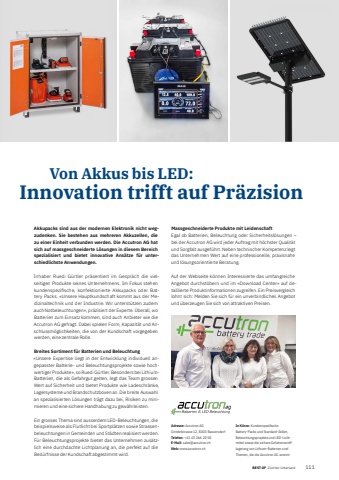 BEST OFBEST OF Z%u00fcrcher Unterland Portrait xxx 111 Von Akkus bis LED: Innovation trifft auf Pr%u00e4zisionAkkupacks sind aus der modernen Elektronik nicht wegzudenken. Sie bestehen aus mehreren Akkuzellen, die zu einer Einheit verbunden werden. Die Accutron AG hat sich auf massgeschneiderte L%u00f6sungen in diesem Bereich spezialisiert und bietet innovative Ans%u00e4tze f%u00fcr unterschiedlichste Anwendungen.Inhaber Ruedi G%u00fcrtler pr%u00e4sentiert im Gespr%u00e4ch die vielseitigen Produkte seines Unternehmens. Im Fokus stehen kundenspezifi sche, konfektionierte Akkupacks oder Battery Packs. %u00abUnsere Hauptkundschaft kommt aus der Medizinaltechnik und der Industrie. Wir unterst%u00fctzen zudem auch Notbeleuchtungen%u00bb, pr%u00e4zisiert der Experte. %u00dcberall, wo Batterien zum Einsatz kommen, sind auch Anbieter wie die Accutron AG gefragt. Dabei spielen Form, Kapazit%u00e4t und Anschlussm%u00f6glichkeiten, die von der Kundschaft vorgegeben werden, eine zentrale Rolle.Breites Sortiment f%u00fcr Batterien und Beleuchtung%u00abUnsere Expertise liegt in der Entwicklung individuell angepasster Batterie- und Beleuchtungsprojekte sowie hochwertiger Produkte%u00bb, so Ruedi G%u00fcrtler. Besonders bei LithiumBatterien, die als Gefahrgut gelten, legt das Team grossen Wert auf Sicherheit und bietet Produkte wie Ladeschr%u00e4nke, Lagersysteme und Brandschutzboxen an. Die breite Auswahl an spezialisierten L%u00f6sungen tr%u00e4gt dazu bei, Risiken zu minimieren und eine sichere Handhabung zu gew%u00e4hrleisten.Ein grosses Thema sind ausserdem LED-Beleuchtungen, die beispielsweise als Flutlicht bei Sportpl%u00e4tzen sowie Strassenbeleuchtungen in Gemeinden und St%u00e4dten realisiert werden. F%u00fcr Beleuchtungsprojekte bietet das Unternehmen zus%u00e4tzlich eine durchdachte Lichtplanung an, die perfekt auf die Bed%u00fcrfnisse der Kundschaft abgestimmt wird. Massgeschneiderte Produkte mit LeidenschaftEgal ob Batterien, Beleuchtung oder Sicherheitsl%u00f6sungen %u2013 bei der Accutron AG wird jeder Auftrag mit h%u00f6chster Qualit%u00e4t und Sorgfalt ausgef%u00fchrt. Neben technischer Kompetenz legt das Unternehmen Wert auf eine professionelle, praxisnahe und l%u00f6sungsorientierte Beratung.Auf der Webseite k%u00f6nnen Interessierte das umfangreiche Angebot durchst%u00f6bern und im %u00abDownload Center%u00bb auf detaillierte Produktinformationen zugreifen. Ein Preisvergleich lohnt sich: Melden Sie sich f%u00fcr ein unverbindliches Angebot und %u00fcberzeugen Sie sich von attraktiven Preisen.Adresse: Accutron AGGrindelstrasse 12, 8303 BassersdorfTelefon: +41 43 266 20 50E-Mail: sales@accutron.chWeb: www.accutron.chIn K%u00fcrze: Kundenspezifi sche Battery-Packs und Standard-Zellen, Beleuchtungsprojekte und LED-Lichtmittel sowie die sichere Gefahrenstofflagerung von Lithium-Batterien sind Themen, die die Accutron AG vereint.