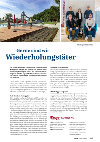BEST OFBEST OF Z%u00fcrcher Unterland Portrait xxx 1151Adresse: Thomet Partner AGAugwilerstrasse 14, 8426 Lufi ngenTelefon: +41 43 255 43 00E-Mail: info@thometpartner.chWeb: www.thometpartner.chIn K%u00fcrze: Wer in der N%u00e4he des Flughafens Z%u00fcrich-Kloten unternehmerisch t%u00e4tig ist, hat gut lachen. Die Region brummt wie kaum eine andere. Insbesondere ist die Baut%u00e4tigkeit in den Gemeinden angeregt. Bauleiter sind gesuchte Fachkr%u00e4fte, Bauleitungsb%u00fcros mit Auftr%u00e4gen eingedeckt. Gerne sind wirWiederholungst%u00e4terDie Thomet Partner AG kann sich nicht %u00fcber eine d%u00fcnne Auftragslage beklagen. Sie profi tiert von der stark wachsenden Flughafenregion Z%u00fcrich. Das klassische Bauleitungsb%u00fcro arbeitet eng mit Architekturb%u00fcros zusammen und steht f%u00fcr Zuverl%u00e4ssigkeit, Unkompliziertheit, Qualit%u00e4t und Konstanz. Pro Bauprojekt ein fest zugeteilter Bauleiter oder eine Bauleiterin, so lautet ein Grundsatz von Inhaber Jan Oppliger, der bereits seit 2006 f%u00fcr die Thomet Partner AG arbeitet. Die Kundschaft soll wissen, wen sie als Ansprechperson hat %u2013 von Beginn bis Fertigstellung einer Baute. Je unkomplizierter und effi zienter, umso besser f%u00fcr die Kundschaft und ihr Budget. Auch %u00f6ffentliche Auftraggeber2015 stieg Jan Oppliger als Teilhaber zu 50 Prozent bei seinem Arbeitgeber ein, vier Jahre sp%u00e4ter %u00fcbernahm er das gut etablierte Bauleitungs-Unternehmen von Gr%u00fcnder Richard Thomet ganz. Heute arbeiten f%u00fcnf Personen in seinem Team, davon vier Bauleiter. Spezialisiert ist die Thomet Partner AG auf den Neubau, respektive Um- oder Erweiterungsbau von Mehrfamilienh%u00e4usern, %u00f6ffentlichen Bauten wie Schulh%u00e4user und industrielle Geb%u00e4ude. %u00abEigentlich machen wir querbeet alles, dennoch tanzen wir nicht auf allen Hochzeiten%u00bb, sagt Jan Oppliger mit einem Augenzwinkern. So geh%u00f6ren auch ausgew%u00e4hlte Einfamilienhaus-Projekte zum Portfolio, wie auf der Webseite einzusehen und detailliert beschrieben ist. Zu einem der konstanten %u00f6ffentlichen Auftraggebern geh%u00f6rt die Stadt Kloten. Hier verwirklichte die Thomet Partner AG die Teilsanierung des Eisstadions und erstellte das neue Eisfeld. Zudem war sie federf%u00fchrend in der Umsetzung des Klotener Durchgangszentrums in Form einer Kollektivunterkunft wie der Sanierung und dem damit verbundenen Erweiterungsbau beim Pflegezentrum im Spitz. Boomende Flughafenregion %u00abWir werden weiterempfohlen. Das ist f%u00fcr uns die beste Werbung%u00bb, sagt Jan Oppliger. Und weiter: %u00abSo betrachtet sind wir gerne Wiederholungst%u00e4ter, sei es im Auftrag von Gemeinden oder von Privaten.%u00bb Da die Region rund um den Flughafen mit der Stammregion, in welcher die Thomet Partner AG t%u00e4tig ist, wie etwa das Z%u00fcrcher Unterland und Bezirk B%u00fclach, von einem regelrechten Bauboom heimgesucht wird, geht dem agilen Bauleitungsb%u00fcro die Arbeit nicht so schnell aus. Dennoch m%u00f6chte Jan Oppliger mit seinem Unternehmen in Zukunft nicht zu stark wachsen. Mittelfristig gut ausgelastetDas %u00fcberschaubare und flexible Team garantiert seinen Auftraggebenden, dass die Bauleitenden oft vor Ort auf der Baustelle sind. %u00abNur so l%u00e4ufts rund auf der Baustelle. Wir wollen keine reinen Schreibtischt%u00e4ter sein%u00bb, bringt es der erfahrene Bauprofi Jan Oppliger auf den Punkt. Aktuell besch%u00e4ftigt sich das Thomet-Team insbesondere mit diversen Neubauten und Gesamtsanierungen. Bis Ende 2026 ist das Bauleitungsunternehmen mit Auftr%u00e4gen gut ausgelastet. Die Region Z%u00fcrich Flughafen brummt. Die Thomet Partner ist mitten im wachsenden %u00abNest%u00bb.Das Team mit Inhaber Jan Oppliger, diplomierter Bauleiter (hinten rechts)