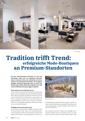 10 BEST OF BEST OF Portrait xxx %u00dcberregionalTradition trifft Trend: erfolgreiche Mode-Boutiquen an Premium-Standorten Mit einer beeindruckenden Geschichte von fast zwei Jahrzehnten haben sich die Ledergerber Mode-Boutiquen in K%u00fcsnacht, Meilen und im Glattzentrum als feste Gr%u00f6ssen in der Modelandschaft etabliert. Die strategisch gew%u00e4hlten Standorte %u00fcberzeugen nicht nur durch ihre zentrale Lage, sondern bieten den Kundinnen auch optimale Erreichbarkeit dank grossz%u00fcgiger Parkpl%u00e4tze.Mode-Expertise und erstklassiger ServiceIn allen Filialen erwartet Sie ein modeversiertes Beratungsteam, das Ihre individuellen W%u00fcnsche und Stilvorlieben perfekt versteht und umsetzt. Kundenw%u00fcnsche k%u00f6nnen dank der engen Zusammenarbeit der Boutiquen untereinander und mit dem Haupthaus in Baden fast immer erf%u00fcllt werden. Die elegant gestalteten Verkaufsr%u00e4ume bilden den perfekten Rahmen f%u00fcr die sorgf%u00e4ltig ausgew%u00e4hlten Kollektionen beliebter und renommierter Marken.Vielf%u00e4ltiges Sortiment f%u00fcr jeden AnlassDas Sortiment in den Boutiquen spiegelt die Vielfalt moderner Lebensweisen wider: seien es der moderne Business Look, das elegante Outfi t f%u00fcr Ihren pers%u00f6nlichen Anlass oder l%u00e4ssige Casual Styles. Hochwertige Basics werden durch aussergew%u00f6hnliche Statement-Pieces erg%u00e4nzt. Feine Strickwaren aus edlen Materialien, perfekt geschnittene Blazer und hochwertige Kleider namhafter Designer bilden das Herzst%u00fcck der Kollektionen.Das Accessoire-Sortiment umfasst eine vielf%u00e4ltige Schuhauswahl, trendige Taschen, exquisiten Schmuck und edle Schals, die jedem Outfi t den letzten Schliff verleihen. Jede Filiale in MeilenFiliale im Glattzentrum